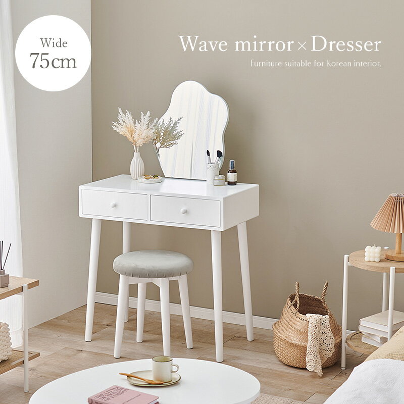 ■サイズ:(約)幅75×奥行48×高さ123.5cm、スツール:(約)幅36×奥行36×高さ45cm ■素材:主材:繊維板、脚部:天然木、張地:ポリエステル ■その他:組立式 ※画面上のカラーはブラウザや設定により、実物とは若干異なる場合がございます。 あらかじめご了承の上ご注文ください。 【キーワード】 ドレッサー デスク おすすめ 可愛い かわいい おしゃれ ホワイト 白 ウッド 一面鏡 韓国風 インテリア 北欧 椅子付き スツール付き 化粧台 鏡台 引き出し付き 収納付き コンパクト 小さい 小さめ アンティーク 安い 激安 人気ランキング エレガント 一人暮らし シンプル 机 幅75 姫系 フレンチ 部屋 メイク収納 木製 ワンルーム ミラー付き 鏡付き