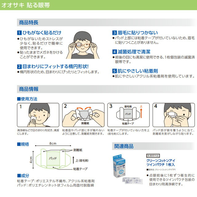 耳ひものストレスがない貼るだけで使用できる眼帯です。 ●貼ったままで眼鏡をかけることができます。 ●楕円形状のため、目まわりにぴったりとフィットします。 ●パッド上部には粘着テープが付いていないため、眉毛に貼りつくことがありません。 ●術後の目にも清潔に使用できる、1枚個包装の滅菌済眼帯です。 ●肌にやさしいアクリル系粘着剤を使用しています。 商品名 オオサキ 貼る眼帯 成分 [粘着テープ]ポリエステル不織布、アクリル系粘着剤 [パッド]ポリエチレンネット状フィルム両面付脱脂綿 品番 73311 入り数 10枚 50枚入りはこちら サイズ シール部8cm×4cm パッド部4.5cm×3.2cm 製造国 日本 届出番号 23B2X10001000105 メーカー名 オオサキメディカル株式会社 【広告文責】 株式会社ホスピタルサービス(TEL:075-671-2471) 【メーカー/販売業者】オオサキメディカル株式会社 【区分】日本製/医療機器