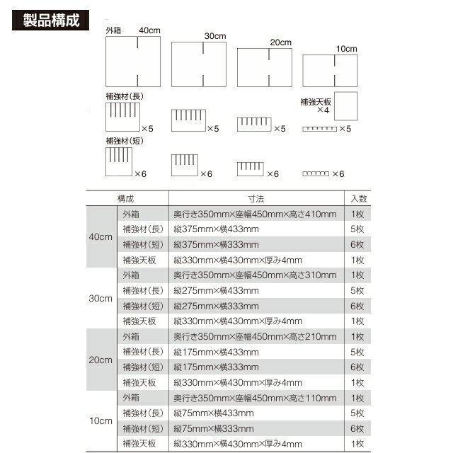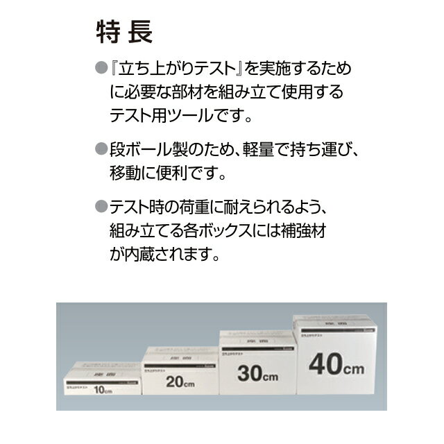 テスト時の荷重に耐えられるよう、組み立てる各ボックスには補強材が内蔵されます。 販売名 立ち上がりテストボックス 品番 19791 サイズ 40cm箱:奥行き350mm×座幅450mm×高さ400mm 30cm箱:奥行き350mm×座幅450mm×高さ300mm 20cm箱:奥行き350mm×座幅450mm×高さ200mm 10cm箱:奥行き350mm×座幅450mm×高さ100mm 耐荷重 120kg 構成材料 外箱、補強材:段ボール 補強天板:ベニヤ板 JANコード 4900070197913 メーカー名 アルケア株式会社