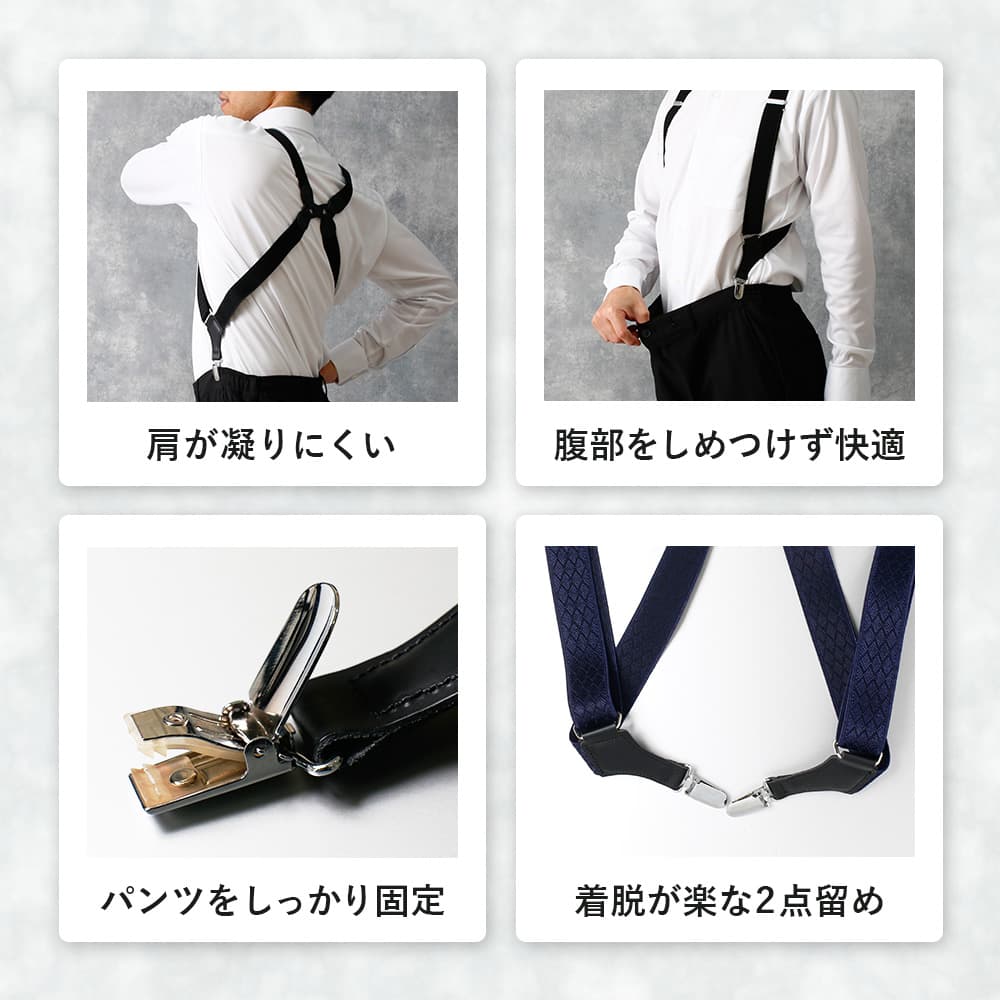 ホルスター サスペンダー[SASPENDER]肩が凝りにくいホルスター型のサスペンダー。サスペンダーを使えば、パンツの折り目を常に綺麗に保つことができ、スーツをより美しく着こなすことができます。また、通常のベルトとは違い、腹部を圧迫しないのもサスペンダーの魅力。快適な着け心地ながら、おしゃれ度がアップするアイテムです。型番TY-SPD-BX-BK TY-SPD-BX-WN TY-SPD-BX-NV商品情報長さ調節可能日本製サイズ・素材・カラー幅30mm身長160-180cm位 体重85kg位まで(上記範囲でも体格により着用が出来ない場合もございます)本体:ゴム、レーヨン 金具:スチール黒 ワイン ネイビー付属品専用BOX店用管理番号exc1配送情報最強配送対応商品(在庫があれば、土日祝も14時までは即日出荷)※臨時休業は除く。詳しくはお届け先を設定のうえ、配送予定をご確認ください。この商品のお問い合わせ番号SBR-item-46685スマートビズはビジネスアパレル専門店です。おしゃれなデザイン性はもちろん、働くビジネスパーソンのために機能性も重視しています。皆様のライフスタイルに沿ったご提案を心がけ、迅速丁寧なお客様サポートを行ってまいります。選ばれているワード着用層[着用層]10代 20代 30代 40代 50代 60代 70代 メンズ 男子 男性 紳士 営業 外回り 父親着用シーン仕事 通勤 会議 打ち合わせ 商談 ビジネス フォーマル 冠婚葬祭 結婚式 式 葬式 葬儀 リモートワーク テレワーク 在宅勤務 在宅ワーク デジカジ ノージャケット ジャケパン スーツ セットアップ 春 夏 秋 冬 オールシーズン 1月 2月 3月 4月 5月 6月 7月 8月 9月 10月 11月 12月ホルスター サスペンダー 3color上半身の動きにしっかりフィット可動式4点留めレザーを使用。ベルトがそれぞれ自由に動くので、上半身全体にフィットします。肩への負担が少なく、快適な着け心地動きにフィットするので、肩が引っ張られるような感覚がありません。30mmの幅広ゴムだからくいこまず快適な着用感。パンツのシルエットを美しくみせるサスペンダーを使えば、パンツの折り目を常に綺麗に保つことができ、スーツをより美しく着こなすことができます。お腹をしめつけず快適通常のベルトでは腹部を圧迫してしまいますが、サスペンダーは腹部をしめつけることがなく快適です。樹脂素材のクロップでしっかり固定クリップの内側には樹脂素材を使用。しっかり留まりながらも衣服へのダメージが少ないこだわりのクリップです。黒 ブラック 紺 ネイビー ワイン 赤 サイズ 身長160〜180cm位 体重:85kgまで※上記範囲でも体格により着用が出来ない場合もございます。