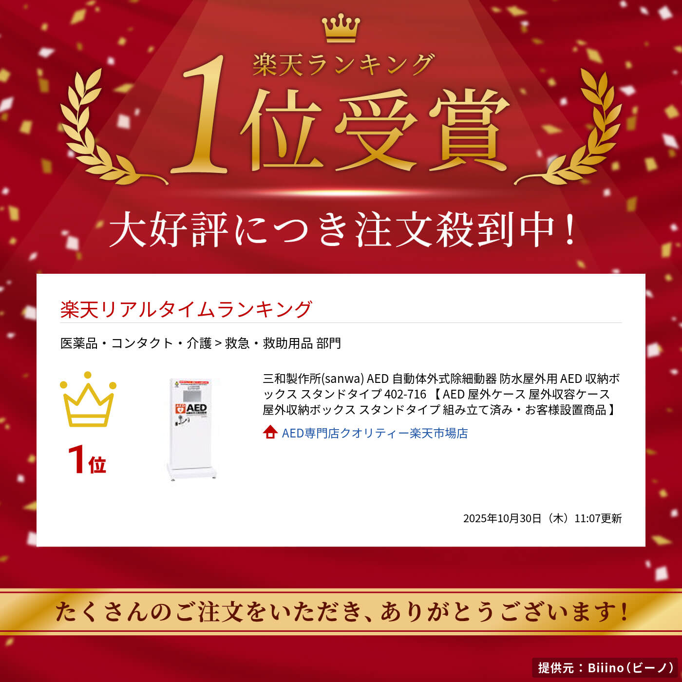 メーカー直送、お客様設置商品です。 ※店頭受取サービスはご利用いただけません。 必要書類は別途郵送させていただきます。 ※代金引換をご希望のお客様へ メーカーからの直送品とは別に、当店から、集金を目的に、必用書類を代金引換で送ります。 この場合、メーカーから直接送られてくる商品と、ご注文商品を集金のための代金引換品(必用書類)を、別々にお受け取りいただくことになります。 商品説明 ●IP55相当の防水・防塵構造 ●AED設置部は断熱材入り二重構造 ●全AED機種に対応 国内で使用されている全機種のAEDが収納できます。※品質向上の為、外観は予告なく変更することがあります。 ※一部機種につきましては収納の際中板を外す必要があります。 国内で使用されている全機種のAEDが収納できます。 収納可能な主なAEDの機種 ・CUメディカル社 AED CU-SP1 ・フィリップス社 AED ハートスタート HS1 ・日本光電 AED-3100 /AED-3200 / AED-3150 / AED-3250 ・旭化成 ZOLL AED Plus 等 ●AEDを置く棚板の高さは調節可能です。 【注意事項】 ・温度調節機能はありません。 ・中に入れるAEDの動作条件の温度を超えない環境に設置してください。 ・BOXへ直射日光が当たらない場所に設置してください。 ・北海道や東北地方等、寒冷地へのご設置の場合はご注文をお断りさせていただきます。 製品名:防水屋外用AED収納ボックススタンドタイプ サイズ:幅470×奥行400×高さ1020mm 重 量:38kg 材 質:本体:スチール、耐候粉体塗装、窓:ポリカーボネート 付属品 床固定用金具、コンクリートアンカー、AED使用方法A3ポスター 商品コード:402-713