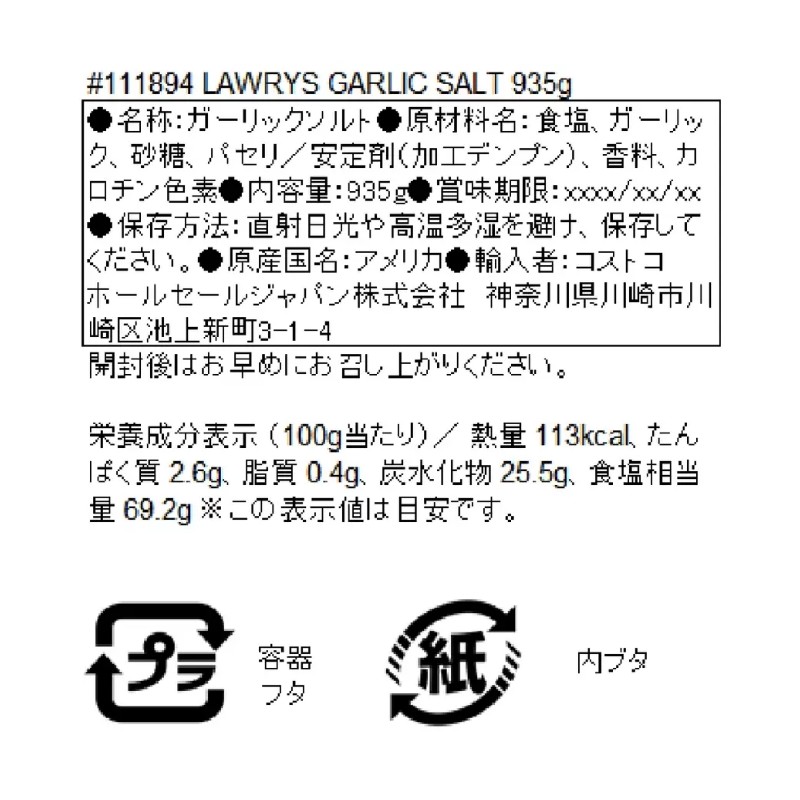 (LAWRY’S ロウリーズ ガーリックソルト 935g)ローリーズ にんにく 調味料 塩 パセリ アメリカ スパイス 味付 111894
