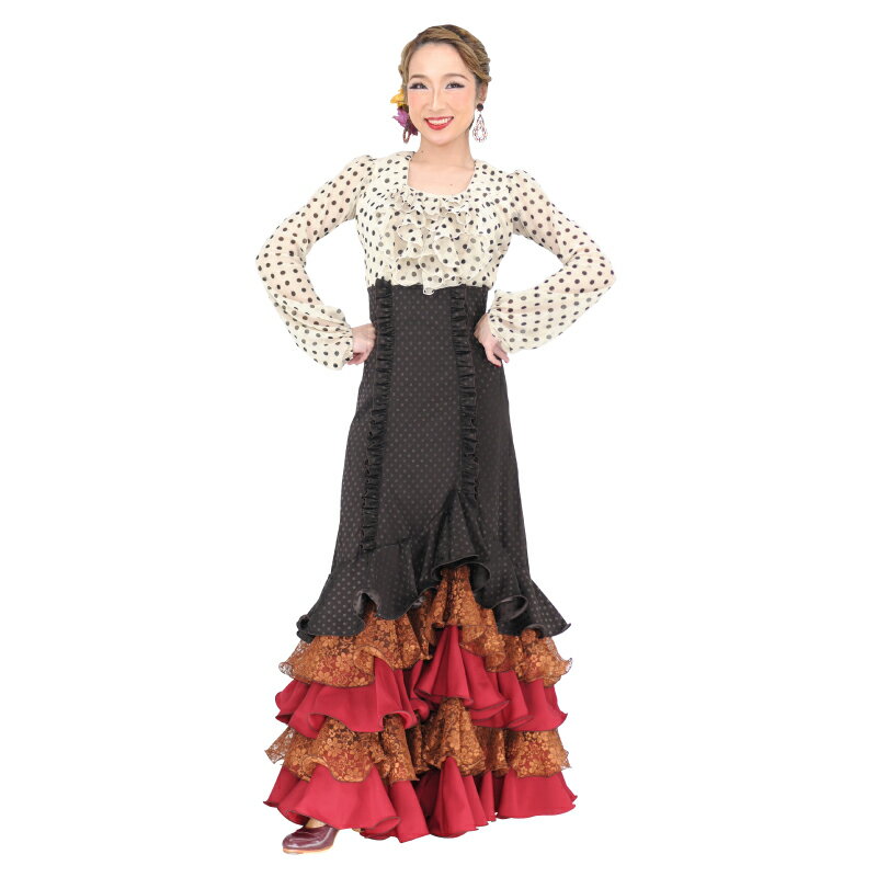 【オーダー商品】HB-1504 ドレープ付パフスリーブブラウス アイボリー/ブラック 10mm玉「1点のみメール便可」フラメンコ衣装 発表会