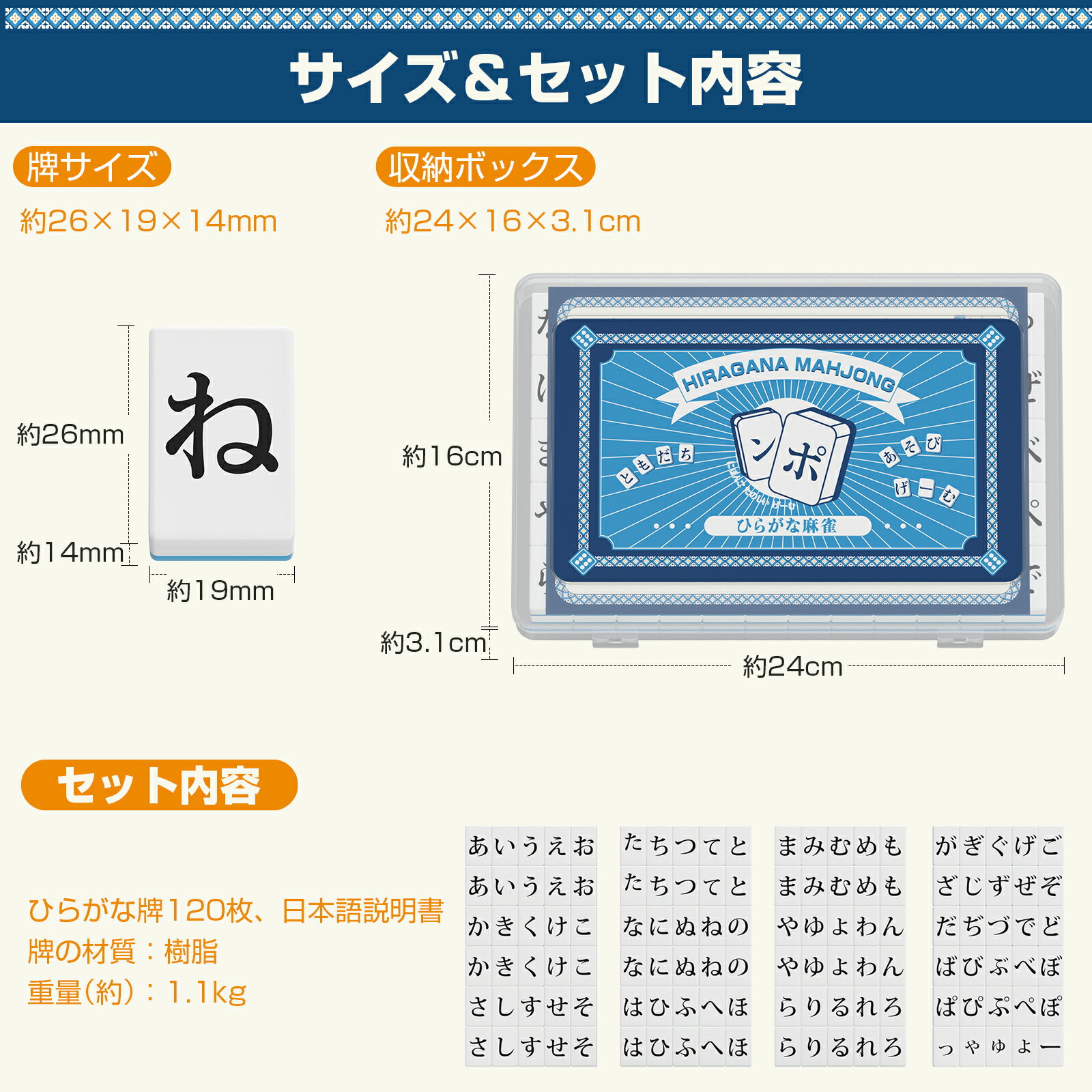 商品名 ひらがな麻雀 サイズ サイズ(牌): 26×19×14mm 重量(約):1.1kg 材質:樹脂 サイズ(収納ボックス): 24×16×3.1cm ※実寸サイズを測っているため多少誤差がでる場合があります。 セット内容 麻雀牌120枚 収納ボックス 日本語説明書 お手入れ方法 1.麻雀牌のお手入れは原則空拭きです。 2.汚れがひどい場合は水で濡らしたタオルで拭いても構いませんが、最後は空拭きで仕上げて下さい。 3.有機溶媒・化学洗剤で拭くと、牌の塗料を剥がす原因になりますのでお控えください。 注意事項 ※商品管理には十分留意しておりますが、万一、初期不良品であった場合、 またはご注文の商品と違う場合は商品到着後、ご注文番号とお写真を、到着から7日以内に当店までご連絡をお願いいたします。当店にて確認後、部品再送または良品とご交換させていただきます。 ※商品写真はできる限り実物の色に近づけるよう徹底しておりますが、 お使いのモニター設定、お部屋の照明等により実際の商品と色味が多少異なる場合がございます。予めご了承ください。 ※商品は海外製品になりますので、多少の傷や汚れがある場合も御座います。 ※複数店舗を運営しておりますため、ご注文の入れ違い等で欠品などになってしまう場合がございます。万が一、発送が遅れる場合はご案内差し上げます。誠に恐れ入りますがご了承くださいますよう、お願い申し上げます。おすすめ商品