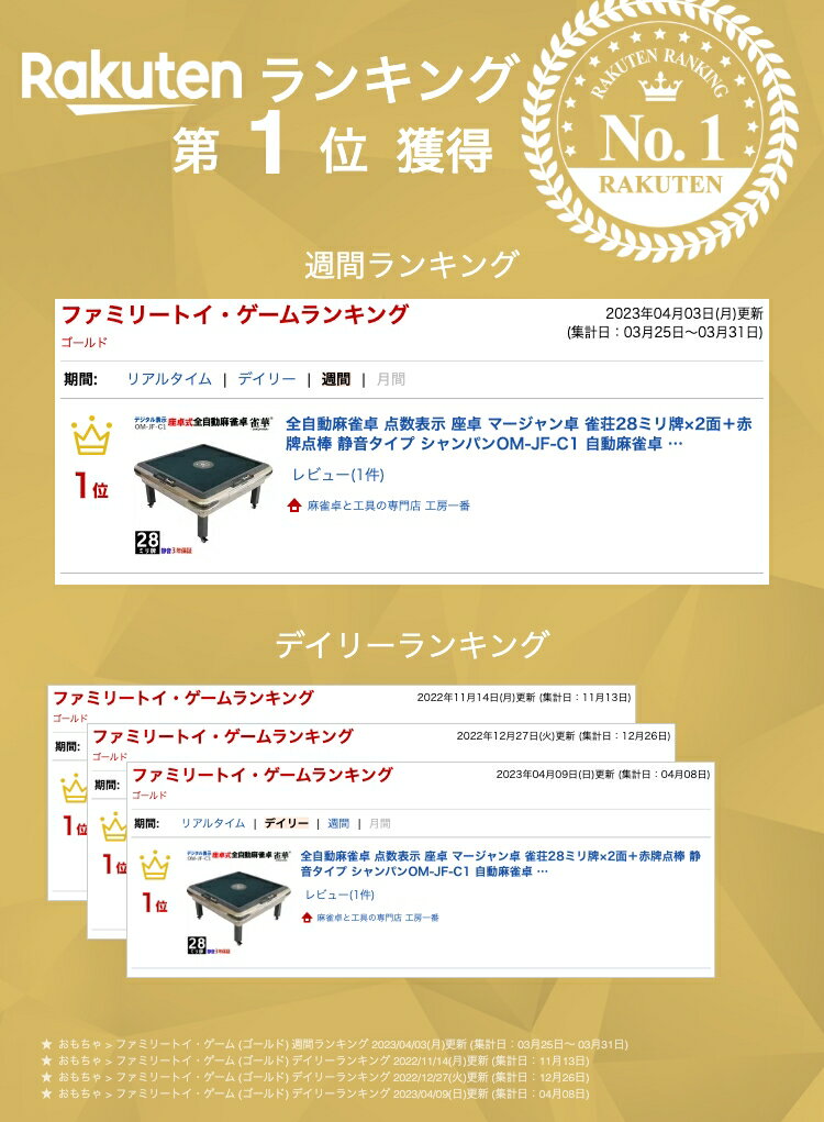 こちらも注目☆麻雀卓 新登場 全自動麻雀卓 折りたたみ 座卓 兼用タイプ マージャン卓 雀荘28ミリ牌... 97,000円 おすすめ 全自動麻雀卓 点数表示 折りたたみ マージャン卓 雀荘牌28ミリ牌×2面+赤牌 静音... 138,000円 人気 【楽天1位】全自動麻雀卓 折りたたみ マージャン卓 雀荘28ミリ牌×2面.. 75,000円 【楽天1位】全自動麻雀卓 折りたたみ マージャン卓 雀荘牌33ミリ牌×2面... 68,000円 全自動麻雀卓 点数表示 折りたたみ マージャン卓 雀荘牌28ミリ牌×2面... 126,000円 全自動麻雀卓 点数表示 折りたたみ マージャン卓 雀荘牌28ミリ牌×2面... 126,000円 全自動麻雀卓 点数表示 テーブルタイプ マージャン卓 雀荘牌28ミリ牌×2面+赤牌... 126,000円 全自動麻雀卓 点数表示 折りたたみ マージャン卓 雀荘牌28ミリ牌×2面+赤牌 静音... 126,000円 全自動麻雀卓 点数表示 折りたたみ マージャン卓 雀荘牌28ミリ牌×2面+赤牌点棒... 126,000円 ※この商品はサイドカバーの色が変更になる場合がございます。 ご了承ください。 商品到着後、すぐに現品を確認して下さい。 商品の設置・使用後の返品及び交換はお受けできません。 ※組立後、正常に動作する事を確認するまでは段ボールなどの梱包材は破棄しないようお願い致します。 初期不良の場合、配送途中にダメージを受けていないか段ボールを確認させていただく場合がございます。 また、修理対応となった場合、お客様自身で返送用段ボールをご用意いただく必要がございます。 点棒は使わない持ち点デジタル表示全自動麻雀卓!自宅にいながら雀荘さながらの麻雀が楽しめる全自動麻雀卓! この全自動麻雀卓は凄い!持ち点デジタル表示。ボタン操作で得点をやり取り、点棒は使わない。麻雀牌は雀荘で主流の28サイズ採用、プロ仕様にこだわりました。 ※本製品は点棒のうけわたしをデジタルで行う製品となります。あがり役の点数自動計算機能は付いておりおりません。 ★保証期間:配達日より36ヶ月(初期不良は配達日より7日間) ★牌は日本式デザイン+雀荘などで主流な28ミリサイズを採用 ★長年の実績のある麻雀卓製造工場で生産され、出荷前全品検査を行っています。 ※麻雀卓は日本国内のみ発送対応しております。 海外への発送は行っておりません。 ご了承ください。 また、海外の電圧に対応しておりません。 ■商品名: 全自動麻雀卓 点数表示 自動麻雀卓 持ち点デジタル表示 マージャン卓 麻雀 折りたたみ 牌 セット テーブル 点棒 グッズ ゲーム マット 大きめ 折りたたみ式 赤牌 入門 セット 雀荘牌 28ミリ シャンパンゴールド ゴールドベージュ 卓 雀卓 新品 全自動 静音 静音タイプ 家庭用 娯楽 練習 プレゼント マージャンテーブル 麻雀台 自動 おすすめ おしゃれ 家 ★商品詳細★ 商品名:折りたたみ式点数表示全自動麻雀卓 型式名:OM-JF-C1 梱包サイズ:横900×縦900×高さ300(mm) 本体:横960×縦960×高さ410.9(mm)ローラ取り付け後高さ470(mm)(外装枠装着時) 製品重量:約48.2kg 天板内:横81.5×縦81.5(mm) 牌のサイズ :およそ 28mm ×20.5mm ×16.5mm 電源:50HZ/60HZ (東・西日本両対応) 電源ケーブル:(290cm)より給電 定格電圧:AC100V 定格商品電力:105W ゲームモード:01〜39まで設定可能。※通常は「09」になっています。 保証期間:商品配達日より36ヶ月 牌の種類:赤牌は8枚・白の牌は名真っ白・イーソーの鳥デザイン PSE検査:実施済み PL保険:加入済 運送保険:加入済 検品・検査の実施:出荷前全品動作確認検査を行っています ★付属品★ 28mm麻雀牌×2セット(1卓分)、点棒・焼鳥/起家マーク、布カバー、点棒、電源ケーブル、日本語説明書、簡単操作パネルシール×4枚、ドライバー、天板清掃用ブラシ (基本)ピンズ9種×4ヶ、ソウズ9種×4ヶ、マンズ9種×4ヶ、字ハイ7種×4ヶ (予備)春1ヶ、夏1ヶ、秋1ヶ、冬1ヶ、赤5ピン4ヶ、赤5ソウ2ヶ、赤5マン2ヶ (1面総数)148牌 ★ゲーム設定★ マージャンのゲーム設定は39種類ございます。 通常の4人/3人麻雀はもちろん、3人麻雀花有りや、3人麻雀 3箇所セットor4箇所セットなど、 様々な麻雀牌のセット方式をダイヤル一つで切り替え可能です。 ・3人打108牌 ・4人打136牌 ・4人花打140牌 ・4人花花打144牌ほか多数あり ★組み立てについて★ 組立は男性2人で15〜30分程度。(本体-枠-脚をネジで固定) 重量物ですので、脚の上に本体を乗せるところだけ、2人での作業が必要です。 製品の改良のため、予告なく仕様変更を行う場合があります(枠の細部デザインが異なる場合がございます) ★注意事項★ ※分解しないでください。 ※強い衝撃を与えないでください。 ※飲み物などをこぼすと故障の原因になりますのでご注意ください。 ※組立の際に指を挟んだり、足に落としたりしないようご注意ください。※組立後、正常に動作する事を確認するまでは段ボールなどの梱包材は破棄しないようお願い致します。 ※ネジの緩みなどが無いよう、組み立ての際はもちろん日々のメンテナンスをお願いいたします。 建物の構造によっては隣人のご迷惑になる場合がございますので、使用時間帯などにご注意ください。※商