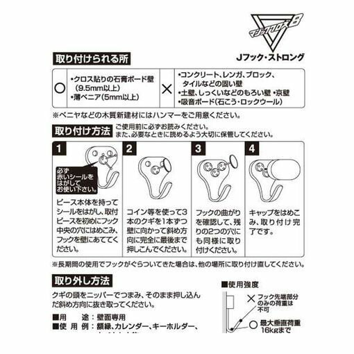 【商品説明】■Jフックシリーズ最強のフック!耐荷重16kg!■クギがクロスして、石膏ボード壁に強力固定!■抜き跡が目立たない!■コイン等で取付け簡単!■壁面専用。使用例:額縁、カベカケ小物など■取付けられる場所:クロス貼りの石膏ボード壁(9.5mm以上)、薄ベニヤ(5mm以上)■■ベニヤなどの木質新建材にはハンマーをご用意ください。■■石膏ボード壁の取り付けには、専用工具(プッシュマジック、クギ押しくん)もございます。■耐荷重:16kg■色:ニッケルメッキ■材質:本体:鉄、キャップ・取付ピース:A4904260202951