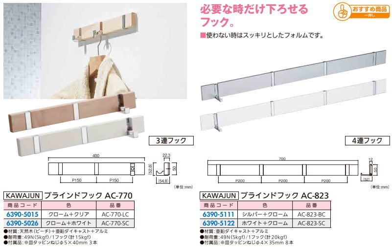必要な時だけ下ろせるフック。使わないときはスッキリとしたフォルムです。材質:天然木(ビーチ)+亜鉛ダイキャスト+アルミ耐荷重:49N(5kgf)/1フック(計15kgf)付属品:+SUS皿タッピンねじφ5×35mm 3本全長:400mm