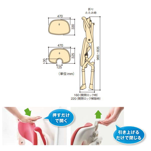 【配送に関するご案内】※こちらの商品はメーカー直送品となり、日曜・祝日のお届けはできません※お届け先には会社名か屋号のご指定が必要となります※代金引換はご利用いただけません※沖縄・離島は送料見積もりです押して開く。引いてたたむ。いつでも、楽らくアクション。※日・祝日のお届け日指定、個人宅へのお届けはできません。前かがみにならずに折りたためるので、腰、膝への負担を軽減。座面高さが48cmまで調整可能(2cmピッチ、7段階)。サイズ:幅51×奥行48〜53×高さ71〜83cm(座面までの高さ:36〜48cm)(折りたたみ時:幅51×奥行16×高さ83.5〜96.5cm、開閉ロック時)重量:約5.2kg
