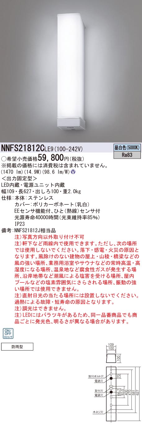 βパナソニック 照明器具【NNFS21812CLE9】一体型LEDベースライト センサ機能付ウォールライト 防雨 ステンレス 縦付型 昼白色 20形 Hf16形器具相当 {V}