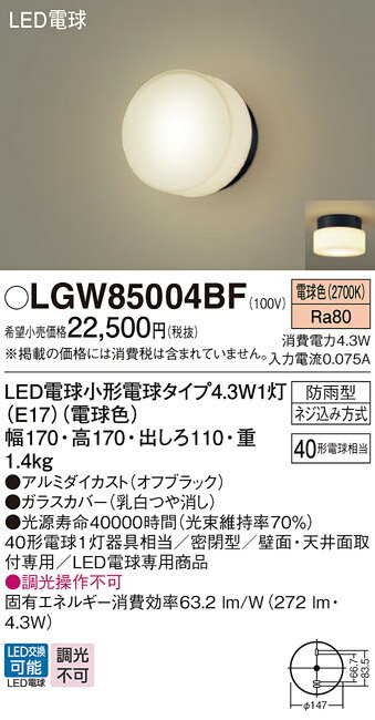 βパナソニック 照明器具【LGW85004BF】エクステリアブラケット ネジ込み方式 40形電球相当 電球色 調光不可 オフブラック 防雨型 {E}