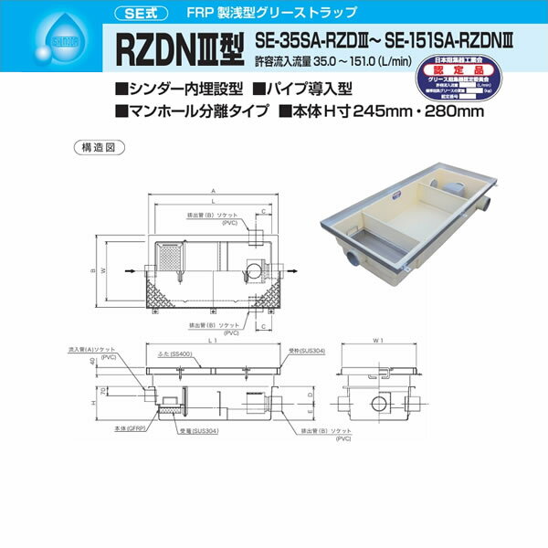 ●下田エコテック 【SE-75SA-RZDNIII(鋼板製錆止め塗装蓋付)】FRP製浅型グリーストラップ SE式 RZDNIII型 許容流入流量75(L/min) 受注約1週〔IE〕