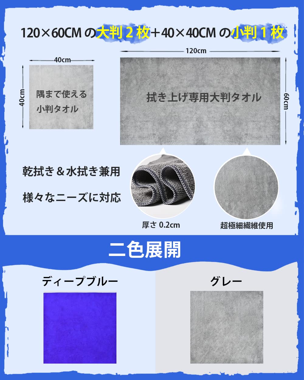 商品情報商品の説明説明 商品の説明 【洗車タオル 大判★拭き上げ専用大判タオル】120CM*60CMの大判2枚+40×40CMの小判1枚の使いやすいお得セット(大判と小判の厚さ約0.2cm)。AutoGo 洗車タオル 大判は車一台分丸まる業務拭き可能なサイズで大変お得です。洗車タオルに使用されている柔らかい特製マイクロファイバーは吸収性に優れ、糸くずやかすを残すことなく、そして塗装やコーティングなどの表面を傷つけることなく、汚れやほこり、他の粒子を捉えられるように作られています。ふんわりなめらかタッチで汚れを拭き取り、車や家具に傷を付けません。肌にも優しい素材です。更に、小判40×40CMも付き、隅まで使えます。 ご注意(免責)>必ずお読みください 【注意事項★洗車タオル】●使用時:水拭き取り用タオル、コート剤&ワックス拭き取り用と分けて使用してください。●使用後(お手入れ):用途別のタオルはコート剤の成分が付着し吸水力が低下する原因となりますので、一緒に洗わないでください。●水拭き取り用タオル:洗剤を使わず水で汚れを落とし、軽く絞ってから干してください。汚れが気になる場合は中性洗剤をご使用ください。●コート剤&ワックス拭き取り用タオル:中性洗剤で汚れを落とし、軽く絞ってから干してください。●柔軟剤、塩素系漂白剤の使用は性能を低下させる恐れがありますのでお避け下さい。●商品到着後、確認等を必ず行ってください。 商品初期不良の場合は、どうぞご遠慮なくご連絡ください。主な仕様 【洗車タオル 大判★拭き上げ専用大判タオル】120CM*60CMの大判2枚+40×40CMの小判1枚の使いやすいお得セット(大判と小判の厚さ約0.2cm)。AutoGo 洗車タオル 大判は車一台分丸まる業務拭き可能なサイズで大変お得です。洗車タオルに使用されている柔らかい特製マイクロファイバーは吸収性に優れ、糸くずやかすを残すことなく、そして塗装やコーティングなどの表面を傷つけることなく、汚れやほこり、他の粒子を捉えられるように作られています。ふんわりなめらかタッチで汚れを拭き取り、車や家具に傷を付けません。肌にも優しい素材です。更に、小判40×40CMも付き、隅まで使えます。br【洗車タオル 大判★塗装施工車にもGood】AutoGo 洗車タオル 大判は特製マイクロファイバーでできており、細かい隙間の汚れを取り込み、お掃除等にも使えるマイクロファイバークロスです。マイクロファイバーとは超極細繊維のこと。その細さは髪の毛の100分の1以下で、愛車を傷つけることなく水滴をふき取ることが可能です。AutoGo 洗車タオル 大判は、一般的な洗車タオルと比べ、塗装表面に接する表面積が広いため、洗車時間の短縮に非常に効果的です。シミなどの発生を抑えることが出来ます。洗車タオル 大判は、洗車による塗装への傷を最小限に抑えることができます。塗装表面にキズを付けることなく、ワックス施工車やコーティング施工車の拭き取りにもGood!特に車に傷がつくのが気になるあなたにお薦めします。br【洗車タオル 大判★優れた吸水性と速乾性】吸水性と速乾性に優れた洗車タオルです。抜群の超吸水性と超速乾性を併せ持つ特製マイクロファイバータオルは超吸水力によって水をたっぷり吸水します。洗車による傷のリスクを極限まで低減させます。マイクロファイバーで水分をあっという間に吸収でき、時間が短縮できるので洗車がラクになります。抜群の吸水力で洗車後の拭き取りも速い!優れた速乾性を備えています。AutoGo 洗車タオル 大判はマイクロファイバー製なので通気性が良く、絞って乾かしやすいので、カビなどの細菌も繁殖しにくくなっています。br【洗車タオル 大判★様々なニーズに対応】洗車や家事用に最適です。乾拭きでも水拭きでも使えます。マイクロファイバーの力でしっかり汚れや曇りなどを拭き取り、愛車をピカピカにします。洗車以外にも、家電製品・家具・窓ガラス・鏡・キッチンのお掃除など、日常生活の幅広いシーンでご使用いただけます。吸収力を追求した製品のため、タオルに厚みがあり絞りにくくなっています。使用後はそのまま風通しのよい場所で干してください。柔軟剤、塩素系漂白剤の使用は性能を低下させる恐れがありますのでお避け下さい。br【洗車タオル 大判★メーカー専門店品質保証】AutoGoメーカー専門店の主な取扱製品は車用品でございます。ブランド名 AutoGoは、弊社AutoGoの登録商標です(登録第5909630号)。AutoGo 洗車タオル 大判は工場出荷前と発送前の2段階で検品チェックしておりますので安心してご使用いただけます。万が一、商品 AutoGo 洗車タオル 大判に問題がございましたら、どうぞご遠慮なくご連絡ください。