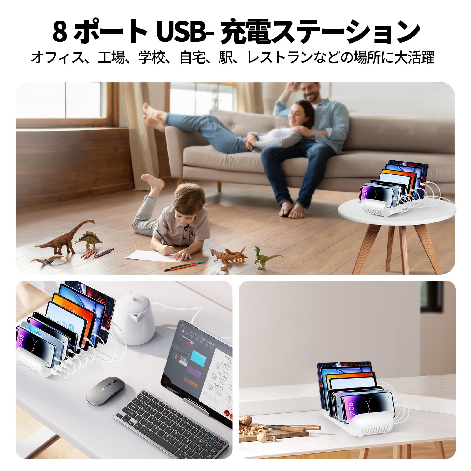 商品情報商品の説明主な仕様 【8台同時充電】この8口スマホスタンド充電ステーションは、8台のデバイスを同時に充電でき、複数の充電器が不要で、コンセントが不足したりデスクトップが散らかったりすることを心配する必要がありません。 卓上充電収納ステーションとして、見苦しく散らかっていたコードを綺麗に片付けてくれます。またコンパクトで会社、オフィス、会議室、家、居間、寝室、台所、ホテル、レストラン、教室に場所を取らずにすっきりとまとまります。br【65Wパワー&PD 30W充電ポート】総出力は65Wで、USB-CポートはPD30Wの高速充電に対応しており、最新のiPhone16シリーズだけでなく、Padにも最高の充電効率を発揮します。30分で50%以上に充電できます。USB-AポートはQC15Wの高速充電に対応し、さまざまなAndroidモデルに適しています。各種デバイスを素早く満充電でき、長時間待つ必要はありません。br【多重保護、スマート充電】アップグレードされた一体型材料に、大面積の散気孔が設置しております。これにより、熱を素早く放出し、複数のデバイスを同時に使用しても過熱することはありません。1.2メートルの電源線と強化されたコネクターより電気を安定的に導き、より安全で安心です。充電時に電圧や電流を自動的に認識して、急速充電しつつバッテリーを損傷することなく寿命を延ばします。充電が完了すると電源が自動的に切断されます。br【汎用の互換性】市販のスマホだけではなく、タブレットやカメラ、ゲーム機など様々な端末の充電が可能です。多口USB充電ステーションはさまざまなシチュエーションで使用できます。職場/家庭/スタジオでは、同時に全員の充電ニーズに応えます。ライブ配信では、複数のライブ機器を同時に充電できます。販売店では、8つのデジタルサンプルを一斉に充電できます。brパッケージ内容:USB充電ステーションx1個 (※注文番号が保証書の代わりとなります)。当店の商品をお買い上げ12ヶ月以内に品質保証いたします。万が一故障発生したら、お気軽にご連絡ください。無償交換あるいは返金の対応は可能です。
