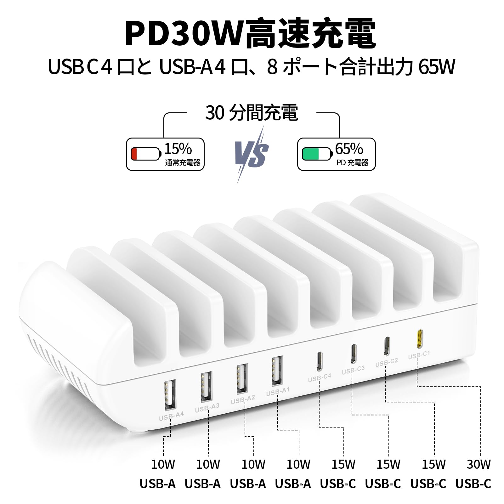 【送料無料】ANNIBER 充電器ステーション 8ポート「USB-C ポートx4+USB-Aポートx4」65W卓上充電スマホスタンド 充電ドック PD30W usb充電器 複数台 iPhone 充電スタンドタブレット充電ラック 収納便利 整理整頓