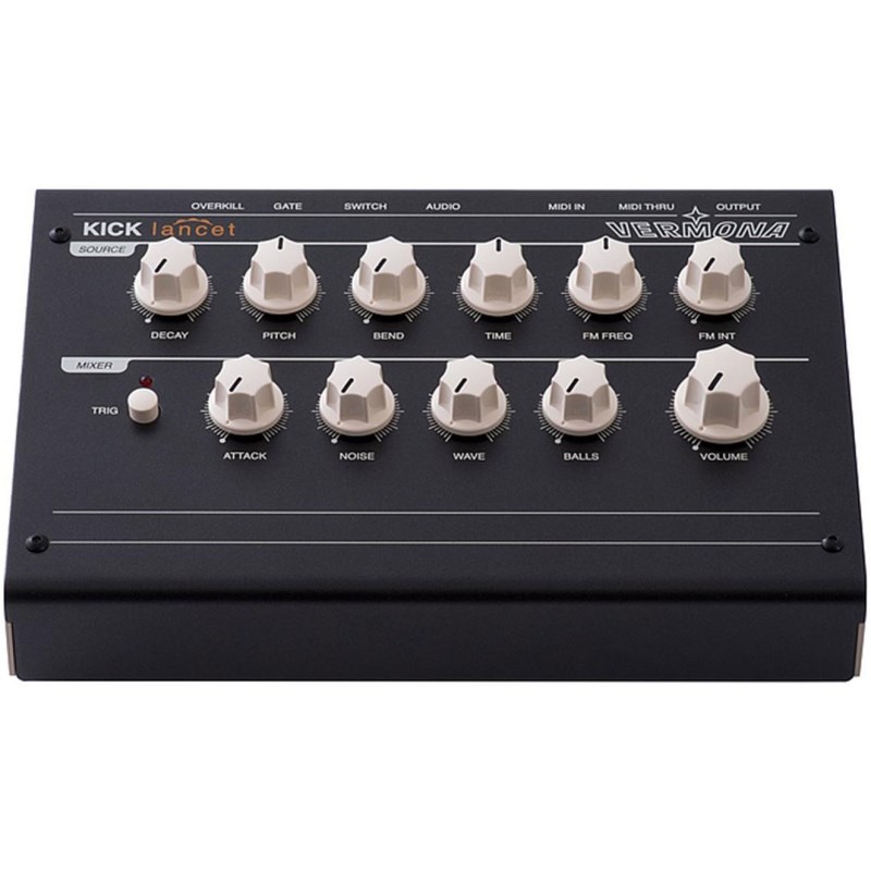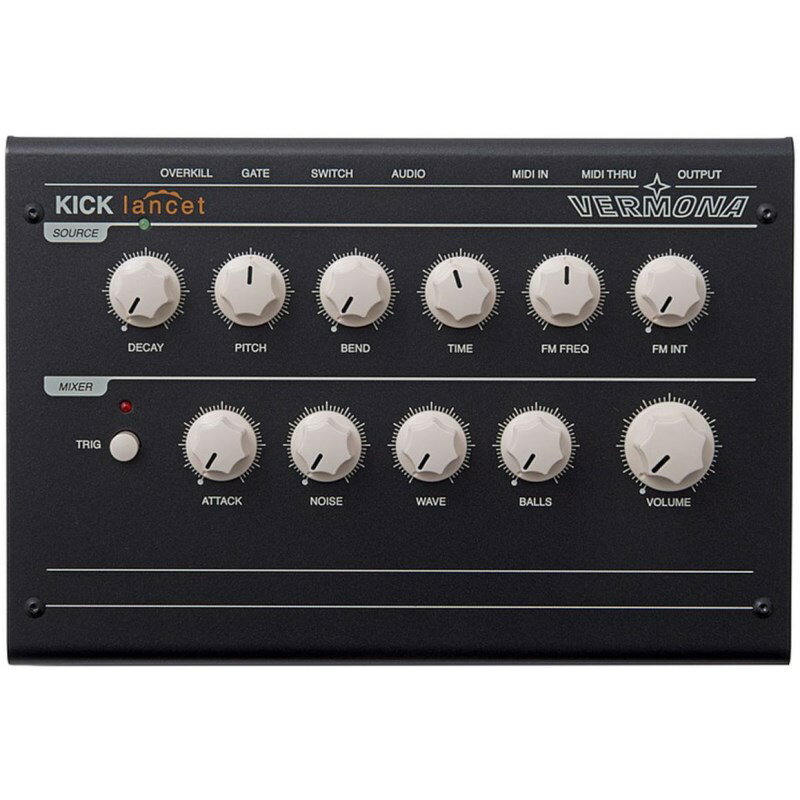 ■商品紹介※こちらの商品は、原則としてお取り寄せでの対応となります。輸入品につき、輸入代理店の在庫状況によってはお届けまでお時間を頂く場合がございます。納期に関しましてはお気軽にお問合せください。 -------------------------------------------Kick Lancet(キック・ランセット)は同社の8チャンネル・アナログドラム音源 DRM-1 MkIIIのキックチャンネルをベースに開発されたアナログ・キックドラム・ジェネレーターです。Kick Lancetは非常に明快で直感的なインターフェイスを持っており、ファットなアナログキックドラムサウンドを簡単に作成することが可能です。MIDI以外にもトリガー機能が充実しており、様々なシステムやパフォーマンスセットへ簡単に導入できます。■簡単な操作でアナログキックドラムサウンドを作成Kick Lancetは厳選されたパラメーターによる直感的なインターフェイスにより、SOURCEセクションはピッチエンベロープと音量の減衰時間の調節、LFOによるピッチモジュレーション機能を搭載しています。これらのパラメーターの設定次第でキックドラムサウンドだけではなく、シンセパーカッションやSE音まで作成することが可能です。MIXERセクションにはアタック音を特徴づけるATTACKとノイズ音を付加するNOISE、オシレーターの波形を調節するWAVE、特定の周波数を強調し音をファットにするBALLS、マスターボリュームを搭載しています。トリガーボタンを押せば外部からのトリガー信号を入力しなくても音色の確認が可能です。■様々なトリガーソースに対応Kick Lancetは様々なトリガーソースによる発音に対応しています。MIDIノートメッセージの他、アナログシンセサイザーなどから発せられる+5Vのゲート信号、一般的なモーメンタリータイプのフットスイッチ、オーディオ信号による発音にも対応しています。DTM環境やアナログモジュラーシンセサイザーシステムに組み込むのはもちろん、パーカッションやドラムセットと組み合わせたパフォーマンスにも対応可能です。■Specifications【音源部】同時発音数:1音音源方式:完全アナログLFO:1【コントローラー】DECAY:VCAのディケイ/リリースタイムPITCH:オシレーターピッチBEND:ピッチエンベロープの深さTIME:ピッチエンベロープのディケイ/リリースタイムFM FREQ:LFOの周波数FM INT:音程をモジュレートするLFOスピードATTACK:アタック部分に短いクリック音を付加NOISE:アタック部分に短いノイズを付加WAVE:サイン波と矩形波のミックスBALLS:音色をファットにします【トリガー】MIDI:任意のチャンネルとノートナンバーに設定可能GATE:+5Vゲート信号SWITCH:メーメンタリータイプのフットスイッチAUDIO:オーディオ信号、トリガー信号【入出力】MIDI:IN, OUT外部トリガー入力端子:標準フォン(GATE, SWITCH, AUDIO)オーディオ出力端子:モノラル アンバランス 標準フォン電源:ACアダプター(12V AC)外形寸法:210 x 145 x 45mm重量:約600g検索キーワード:イケベカテゴリ_シンセサイザー・電子楽器_シンセサイザー_アナログ系シンセ_Vermona_新品 SW_Vermona_新品 JAN:4582348923822 登録日:2012/01/03 シンセサイザー シンセ Synth アナログシンセ フェルモナ ヴェルモナ
