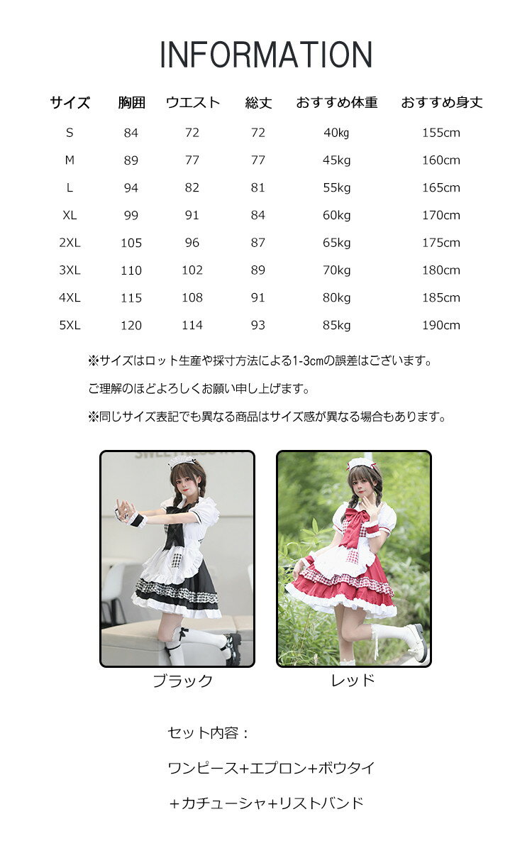 商品情報 商品名 メイド服 ワンピース エプロン カチューシャ リストバンド メイド レディース ワンピ かわいい コスプレ 素材 ポリエステル カラー ブラック レッドサイズ S M L XL 2XL 3XL 4XL 5XL 生産国 中国 包装について 環境保護の観点から、「簡易包装」を推進しております 明細書について 当店ではエコロジーと個人情報流出防止のため、ご指示の無い限り明細書を発行しておりません。 明細書を発行ご希望の場合は個別に承らせていただきます。 お手数おかけいたしますが、ご注文時に備考欄に明細書発行希望の旨、ご入力ください。 配送について 当店は複数の保管倉庫を契約しており、複数商品をご注文の場合、商品保管倉庫により、それぞれ出荷する場合があります。 時間指定は下記よりお選びいただけます。 午前中、14-16時、16-18時、18-20時、19-21時 在庫に関するお知らせ 当社では複数店舗を運営し他店舗でも販売しております為、万一、商品の品切れ等によりお届けできない場合、 またはお届けが遅れる場合がございます。 その際には当方よりメールにてご連絡を差し上げま すが、あらかじめご了承下さいますようお願い致します。 注意 ※1-3cmの誤差がございまいますので、あらかじめご了承ください。 ※長時間濡れたままで重ねて置いたり、摩擦(特に湿った状態での摩擦)や、汗や雨などでぬれた時は他の衣料等に移染する場合がございますのでお気を付け下さいませ。また洗濯の際は移染する場合がございますので、他の物とは分けて洗って下さいませ。 ※素材の特性上、洗濯やクリーニングにより多少縮んだり、斜行(商品全体がねじれて見える状態)が生じる事がございます。 ※お取り扱い前に、商品付属タグの記載もご確認下さい。