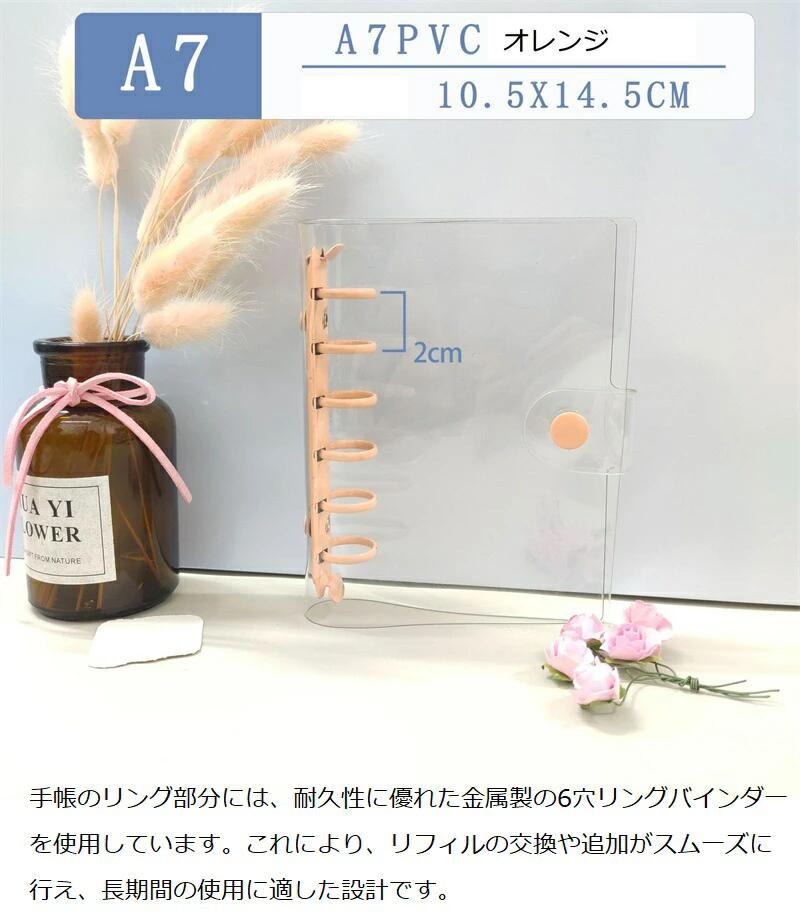 【商品コード】:y813791 【カラー】 オレンジ、パープル、ブルー、イエロー、ピンク、グリーン オレンジ【替芯なし】、パープル【替芯なし】、ブルー【替芯なし】、イエロー【替芯なし】、ピンク【替芯なし】、グリーン【替芯なし】、A7メッシュ替芯のみ【60枚】、 A7横線替芯のみ【60枚】、A7ブランク替芯のみ【60枚】 原産国 : 中国 【この商品について】 仕事も推し活も自由自在 A7バインダーカバー コンパクトなA7サイズのクリアシステム手帳です。 透明なPVC(ポリ塩化ビニル)製のカバーを採用しており、カバーの内側にお好みの写真やイラスト、カード類を挟むことで、オリジナルの表紙デザインを作成できます。季節や気分に合わせて表紙のアレンジを手軽にお楽しみいただけます。 手帳のリング部分には、耐久性に優れた金属製の6穴リングバインダーを使用しています。これにより、リフィルの交換や追加がスムーズに行え、長期間の使用に適した設計です。 スケジュール管理、タスク整理、アイデアメモ、趣味の記録といった幅広いシーンでの活用が可能です。 本体の重量は約80gと軽量で、携帯性にも優れているため、日々の持ち運びにも便利です。ビジネスからプライベートまで、様々な場面でご活用ください。6色のカラーバリエーションから、お好みの色をお選びいただけます。 ※簡易包装となりますのでご理解の程よろしくお願いします。 ※手動測定による1~3cmの測定偏差を許容してください。 ※モニターや光の効果が異なるため、実際の色は写真の色と若干異なる場合があります。 ※仕様・デザインは改良のため予告なく変更することがあります。【商品コード】:y813791 【カラー】 オレンジ、パープル、ブルー、イエロー、ピンク、グリーン オレンジ【替芯なし】、パープル【替芯なし】、ブルー【替芯なし】、イエロー【替芯なし】、ピンク【替芯なし】、グリーン【替芯なし】、A7メッシュ替芯のみ【60枚】、 A7横線替芯のみ【60枚】、A7ブランク替芯のみ【60枚】 原産国 : 中国 【この商品について】 仕事も推し活も自由自在 A7バインダーカバー コンパクトなA7サイズのクリアシステム手帳です。 透明なPVC(ポリ塩化ビニル)製のカバーを採用しており、カバーの内側にお好みの写真やイラスト、カード類を挟むことで、オリジナルの表紙デザインを作成できます。季節や気分に合わせて表紙のアレンジを手軽にお楽しみいただけます。 手帳のリング部分には、耐久性に優れた金属製の6穴リングバインダーを使用しています。これにより、リフィルの交換や追加がスムーズに行え、長期間の使用に適した設計です。 スケジュール管理、タスク整理、アイデアメモ、趣味の記録といった幅広いシーンでの活用が可能です。 本体の重量は約80gと軽量で、携帯性にも優れているため、日々の持ち運びにも便利です。ビジネスからプライベートまで、様々な場面でご活用ください。6色のカラーバリエーションから、お好みの色をお選びいただけます。 ※簡易包装となりますのでご理解の程よろしくお願いします。 ※手動測定による1~3cmの測定偏差を許容してください。 ※モニターや光の効果が異なるため、実際の色は写真の色と若干異なる場合があります。 ※仕様・デザインは改良のため予告なく変更することがあります。