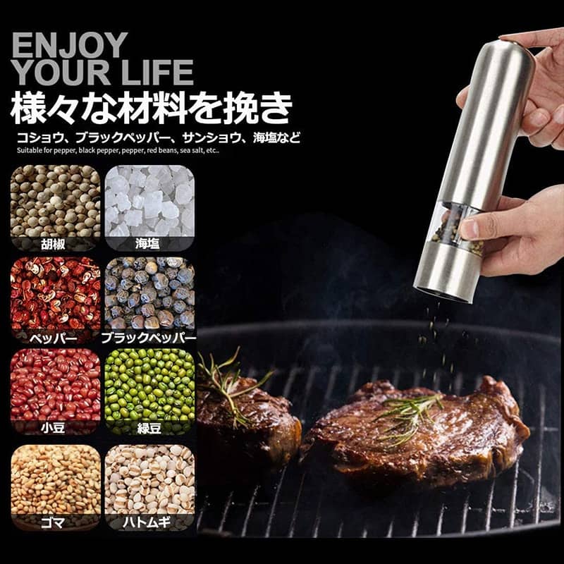 ■商品説明■ 【高級感漂う電動ミル】 重厚感あるステンレスでアクリルスタンド付き、質感にこだわりましたペッパーミル。スタイリッシュでキッチンや食卓、レストランのテーブルに常置してもお しゃれな雰囲気を作るミルです。 【片手で挽けるペッパーミル】 洗練されたデザインで、片手で持ってボタンを押し込むだけで誰でも簡単に新鮮な粒胡椒、花椒、ブラックペッパーなどを楽しむことができます。 【粗さ調節機能が付き】 好みや料理に合わせて、粗さを調節できます。ミルの底の蓋を外せば、粗さ調節用ネジが見えます。ネジを左右に回すだけで、粗ひきと細ひきでの転換ができます。※右回転にて細挽きになった状態から左回転を1O回以上続けるとネジが抜ける場合があり、挽けなく場合もあります。 【2個セットとライト付き】 2個セットで、ベツベツに分けて挽い、家庭用もレストラン用も便利。底部にライトが付き、光の足りない時も使えます。 ※【電池別売】使用する乾電池は1.5V単3形(AA)アルカリ乾電池4本です。(カーボンバッテリーは使えません) ◇ ご注意 ※日本語説明書は付属致しません。 ※仕様は予告なく変更する場合がございます。 ※全商品、「離島.一部地域」は別途 送料が掛かります。 ※検品を行っておりますが輸入品のため、多少の傷や汚れ等はご了承下さい。