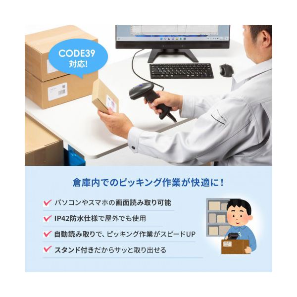 ■商品内容●CCDセンサー搭載でスマートフォンやPCの画面上に表示されたバーコードの読取りができます。 ●オートセンシング機能対応で、専用のスタンドと組み合わせることでハンズフリーで使用することができます。 ●使用後は専用スタンドに収納することでデスクの上をスッキリさせることができます。 ●物流向けで使用するCODE39など様々なバーコードの読取りが可能です。 ●IP42の防水防塵を搭載しています。■商品スペック■インターフェース : USB HID■電源 : USB電源■PCS値 : ≧30%■光源 : 赤色LED(650nm)■走査速度(スキャンスピード) : 100スキャン/秒■セット内容 : 取扱説明書、保証書、専用スタンド■コネクタ形状 : USB A■対応機種 : Windows搭載(DOS/V)パソコン ※USBインターフェースを持つ機種■対応OS Windows : 11, 10■読取可能コード(1次元) : JAN(EAN-8,EAN-13), EAN, UPC-A, UPC-E, NW-7(Codabar), Interleaved 2 of 5(ITF), Industrial 2 of 5, Code 39, Code 128, Matrix 2 of 5, MSI, Code 93, GS1 Databar, GS1 Databar Limited, GS1 Databar Expanded■読取方式 : CCD■保護等級 : IP42■読取角度(ピッチ) : 75°■読取角度(スキュー) : 55°■消費電流(動作時) : 85mA■消費電流(待機時) : 25mA■日本語QR : 非対応■車検証QR対応 : 非対応■送料・配送についての注意事項●本商品の出荷目安は【4 - 7営業日 ※土日・祝除く】となります。●お取り寄せ商品のため、稀にご注文入れ違い等により欠品・遅延となる場合がございます。●北海道への配送につきましては別途追加送料が発生します。 また沖縄県・離島へは配送不可となります。[ BCR-1D9BK ]