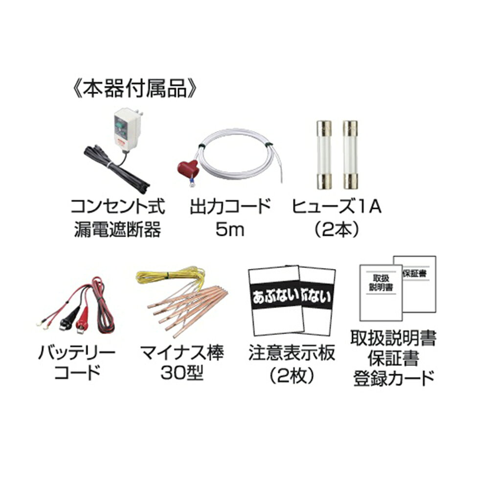 ○本体+3段張の支柱や電線がセットになった商品です。小動物対策におすすめのセットになります。○本体1台あたりの最大電線長は2000mです。※設置条件により異なります。 屋内設置用 DAC-20 ■家庭用電源100Vとバッテリー12Vの両方が使える電子牧棚器です。 屋内設置専用の100Vコンセントタイプ。 コンセント式漏電遮断器が標準装備。 夜間(夜出力)・昼夜間(連続)の出力切替えスイッチ付。 電気用品安全法(PSE)適合品。 「良好」「点検」ランプで出力状況を確認。 小動物対策に。 田畑の周囲に電気さく線(電気を流す裸線)を張り巡らし、この電気さく線に衝撃電流を流します。出力コードより出た衝撃電流は電気さく線を通り動物の体内を流れ、足から地面に流れ、本器のマイナス端子へ戻ってきます。このようにして動物の体内に電気を流し、ショックを与えます。電気ショックですので馴れることはありません。 商品の構成 電気柵に必要な、以下のAとBが揃ったセットです。単体ごとに購入するよりもお買い得になっています。 A:本体セット:コンセント式漏電遮断器、出力コード 5m、ヒューズ1A 2本、バッテリーコード、アース棒 30型、注意表示板 2枚、取扱説明書、保証書/登録カード B:部材セット:◯支柱・・・50個(Φ14mm) ◯ガイシ・・・150個(Φ14mm) ◯電柵線・・・600m分 ◯ゲートハンドル・・・3個 ◯巻取器・・・1個 2つの安心 「盗難補償」 本品購入後、お客様登録をされますと、最長1年間の盗難補償が付いてきます。(この補償によるお客様の保険料の負担はございません)※お客様登録をされていない場合は補償対象外となります。 ■盗難補償内容・補償期間は購入日より最長1年間になります。※セキュリティゲッターは最長3年間になります。 【本器に付属している「盗難登録申込用紙」に必要事項をご記入後、(株)末松電子製作所へFAXまたは郵送いただき、事前に登録をお済ませください。※ご購入時の領収書・納品書などの写は盗難補償時に必要となりますので保証書と一緒に保管ください。】 ・盗難補償の対象は本器のみとなります。・盗難にあった本器と同じ本器が補償されます。(1回限り)・盗難が発生した場合は、お近くの警察署へ盗難届を出していただく必要があります。 ■ご注意■盗難された後、お客様登録される方が増えております。この場合は盗難補償の対象外となりますので、ご購入後すぐ、お客様登録をお済ませください。 「3年間修理無料保証」 取扱説明書、本体添付ラベル等の注意書に基づくお客様の正常なご使用状態のもとで保証期間内に万一故障した場合、無料にて修理させていただきます。 ■修理保証内容メーカー修理保証の対象は本器のみとなります。付属品や消耗品、ならびに付属資材(コンセント式漏電遮断器、アース棒、バッテリーコード、出力コード、ヒューズ、アルカリ電池12V、注意表示板、支柱、ガイシ、コード、ゲートなど)は補償対象外となりますので別途購入をお願いします。 ■ご注意■下記のような場合、保証期間内でも有料修理になることがあります。※その他、自然災害による事故の場合も有料修理になります。