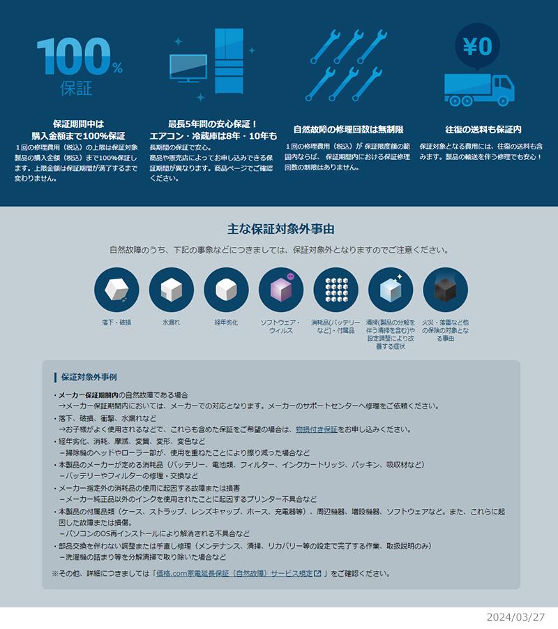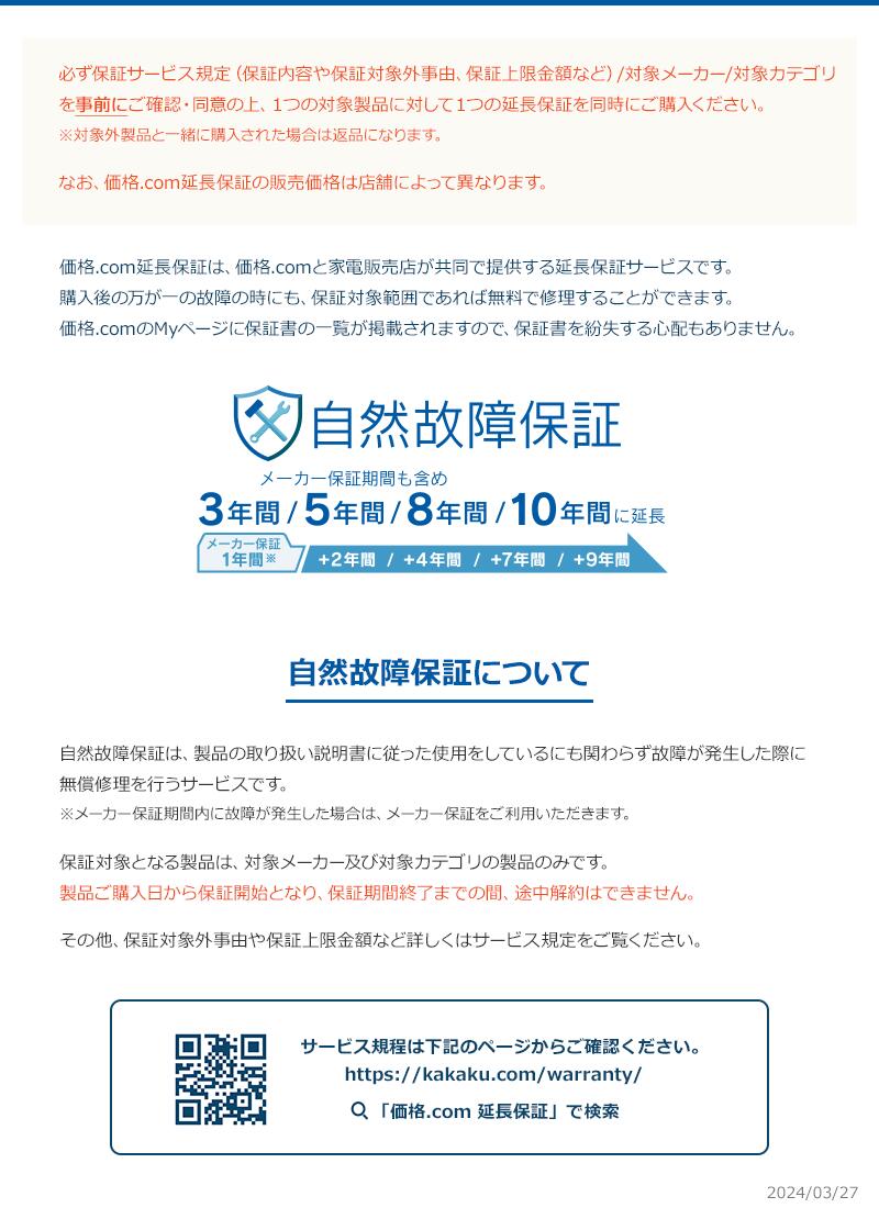 当店と買い物支援サイト「価格.com」が共同で提供する延長保証サービスです。 ご購入いただく前に必ず、説明文、説明画像、 対象製品カテゴリ、対象製品価格のご確認をお願いいたします。 ※価格.com延長保証に関する注意事項※ 製品ご購入日から保証開始となり、保証期間終了までの間、途中解約はできません。詳細はサービス規定をご参照ください。 ※サービス規定については「価格.com延長保証」で検索のうえ、価格.com延長保証の説明ページにある各サービス規定のリンクより必ずご確認ください※ ご了承いただける場合のみご購入をお願いいたします。 対象製品とご一緒にカートに入れてご注文いただきますようお願いいたします。 対象製品と同時にご購入いただけない場合、 延長保証をお付けることはできませんのでご注意ください。 延長保証問い合わせ先は下記となります。 2024年3月31日以前に延長保証に加入したお客様:SOMPOワランティ延長保証サービス【SOMPOワランティ株式会社】 2025年6月9日以降に延長保証に加入したお客様:価格.com延長保証サービス 【株式会社カカクコム】