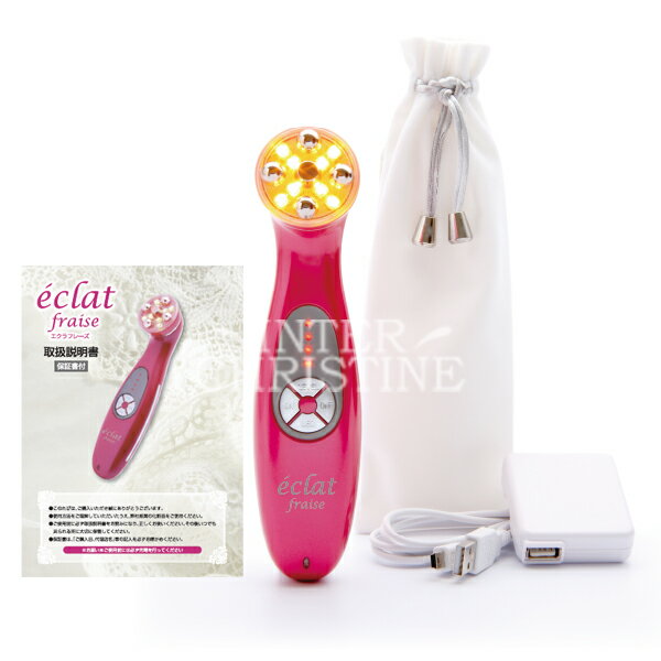 この商品の特徴 エクラフレーズは、5種類の機能(エレクトロポレーション・イオン導入・3色LEDフォトセラピー・EMS・高周波(温熱))が同時にお肌をトリートメントをしてくれる美顔器です。面倒な操作は不要、誰でも使いやすいシンプルな美顔器です。 ボタンはたった4つ(ON・OFF・LEVEL・LED)。電源をONにしたらLEVEL1から始めましょう。LEDはお好みに合わせてレッド・イエロー・ブルー・フラッシュ(3色混合)からお選びいただけます。お手入れに慣れてきたらLEVELを1〜4のお好みの強さに合わせてください。(EMSによる電気的な刺激がございます) <5つの機能> ○エレクトロポレーション 全世界で注目の最新美容法のひとつ。瞬間的にある周波数の微弱電流をお肌に流すことでコラーゲンやエラスチン、ヒアルロン酸といった分子の大きい美容成分を届けることができると言われています。 ○イオン導入 約20年前位からある美容法のひとつ。イオン導入も微弱電流を用います。普段のお手入れでは浸透しにくい美容成分を角質層まで届けることができると言われ、主に水溶性ビタミンCなどが有効です。 ○3色LEDフォトセラピー 私達人間は色と光の影響を無意識に取り入れています。暖色系の色は活性、寒色系の色は鎮静効果があるといわれておりお肌にも良い影響を与えます。長寿命で消費電力が低い軽量LEDはハンディタイプの美容器にピッタリな光源です。 ○EMS EMSとは、Electrical Muscle Stimulationの略です。主に筋肉に効果を発揮します。顔にも数々の筋肉があり、筋肉に変化があれば、その上面にあるお肌も同様の現象が起こります。そこでEMSで筋肉を刺激することがお肌にも最適です。 ○高周波(温熱) こちらも主に筋肉に働きます。筋肉は骨から幾重にも形成されていますのでインナーマッスル(深層筋)と言う深部の筋肉に高周波は効果的と言われています。お食事をしたり、お話したりと私達のお顔の筋肉は使われる部分と普段の生活では中々使われていないインナーマッスルをマッサージするとお顔全体に効果的です。 ご使用方法 洗顔後の清潔なお肌にお使いください。1日1回(約10分)まで、最初の1〜2週間は週2回お手入れし、その後は週に1回位(2回まで)でお手入れしてください。※ボディは入浴後にお使いください。 ※使用する化粧品の導入効果が上がります。 ※エクラフレーズの機能を余すことなくお使いいただくための専用美容液「エレモアスムース」はこちらです。 商品情報 【仕様・定格】 型式番号:SL-005 商品名:エクラフレーズ 電源:ACアダプター 入力電圧 100V〜240V 出力電圧DC5V 1A 消費電力:2W 適用プラグ:USBコネクター 重量:108g 寸法:180×435×50mm 生産国:日本 保証書:ご購入日より1年間 広告文責:株式会社インタークリスティーヌ 0120-552-268 発売元:株式会社サニーライフジャパン 商品区分:雑貨 生産国:日本 ------------ 〇付属の取り扱い説明書に従って正しくお使いください。 ○一度お届けした商品の返品はお受けできかねますので予めご了承ください。 ○万一、器械に不具合が生じた場合は、修理をもって対応させていただきます。 〇保証期間内の無償修理は、説明書に記載された使用方法での故障が対象です。 ○修理は総販売元にて行いますので、送付用にできるだけ専用の箱を保管して下さい。 ○製品の仕様は予告なく変更されることがあります。 〇表記された性能を永続的に保証するものではありません。 ------------ ※ディスプレイの環境により、実際のお色とは異なって見える場合がございますので予めご了承ください。