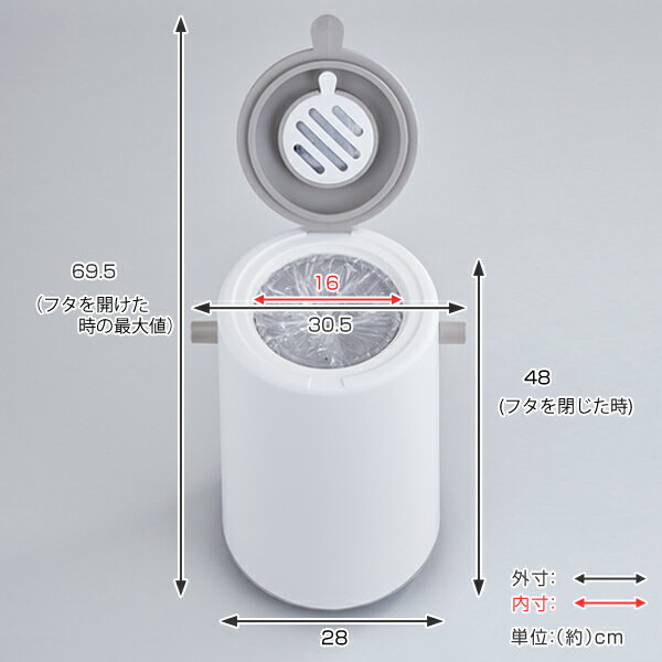 サイズ約 幅30.5×奥行28×高さ48(cm)重量約 1700g容量約 20L内容量1個付属品:専用消臭剤付き(1セット)材質本体、キャップ:ポリプロピレン(耐熱温度:-20~100度)トレー、取っ手:スチロール樹脂(耐熱温度:-20~70度)フタ、袋止め:エチレンプロピレンゴム(耐熱温度:-20~110度)生産国日本製注意事項※お客様のお使いのモニター設定、お部屋の照明等により色味が実際と異なる場合があります※商品ページ内には別の商品を含む画像を使用しています区分返品・キャンセル区分(小型商品)ギフトラッピングページを見るゴミ箱 密閉 20L 防臭 おむつ ふた付き 臭わない 消臭 パッキン ダイパーポット like-it 日本製おすすめポイント臭わないからリビングに置ける密閉おむつペール毎日のことだから「ニオイ漏れ」と「捨てやすさ」にこだわった設計のおむつペールです。密閉できるフタと袋止めの2重構造で、ニオイを外に漏らさないためリビングにも置いていただけます。シンプルなデザインでインテリアの邪魔にならず、生ごみやペット用シーツを捨てるのにもお使いいただけます。こだわったニオイ漏れ対策(1)パッキンを一体にしたラバーキャップおむつペールのフタはパッキンを一体にしたラバーキャップです。保存容器のように隙間なく閉まり、ニオイ漏れを防ぎます。こだわったニオイ漏れ対策(2)フタを開けてもニオイにくいインナーキャップ開けたときに中が見えず、ニオイ漏れも防ぎます。袋止めとして袋を被せて使うので、汚れにくく衛生的です。こだわったニオイ漏れ対策(3)専用消臭剤でニオイをグングン吸収排泄物のニオイの原因である「硫化水素」「メチルメルカプタン」に有効な消臭剤、お部屋の嫌なニオイの原因「アルデヒド」「低級脂肪酸」にも有効な消臭剤を2種類同時に使うことで、オムツのニオイから生ごみ臭までしっかり消臭します。フタ裏にセットするだけで簡単に取り付けできます。商品詳細ニオイを閉じ込めた状態で捨てられる簡単ゴミ捨て中のゴミに触れずにニオイを閉じ込めた状態で袋を結べます。溜まると意外と重たい紙おむつ。本体を引き上げるとゴミ袋が出てくるので、引き抜く必要がなく産後のママやご年配の方でも楽に捨てられます。5日分(30個)のおむつが入る容量20L新生児のおむつなら5日分(30個)、市販のゴミ袋(45L推奨)が使えて経済的です。大人用のおむつも入れることができます。スムーズな袋の着脱で使いやすい袋止めに袋を通して取り付けるだけの簡単仕様で、袋の設置も面倒ではありません。分解できて衛生的上部を持ち上げれば底が簡単に外れるので、ごみを出す時はもちろんのこと、掃除も簡単です。水洗いOK汚れが気になる底もそのまま蛇口で水洗いでき、お手入れが負担になりません。統一感のあるスペースに毎日使うケア用品を一か所にまとめて、ベビーベッドなどに掛けておける『デイリーケア オーガナイザー』と合わせてお使いいただくと、統一感のあるスペースに。→『デイリーケア オーガナイザー』はこちら 同系色でまとめてスタイリッシュな空間に同シリーズのゴミ箱や収納ストッカーなども同系色で揃えると、シンプルでスタイリッシュな空間にまとまります。サイズ対応しているパーツ・オプション消臭剤シリーズ紹介こだわったニオイ漏れ対策おむつペールダイパーポット ベビーベッドに掛けて使えるデイリーケア オーガナイザーあわせて買いたいコンパクトで密閉できるゴミ箱シールズ9.5Lスリムで密閉できるゴミ箱シールズ25L大容量サイズの密閉できるゴミ箱シールズ45Lちょっとしたすき間で使える収納ストッカースリムストレージ14cmすき間を有効活用できる収納ストッカースリムストレージ17cmスリムながら収納力抜群スリムストレージ25.5cm■2018-02-16メーカーのカラー変更のため、ページをリニューアルしました。関連キーワード:ごみ ゴミ ふた 蓋 フタ フタ付き 蓋付き 消臭剤 ニオイ 臭い 防ぐ 対策 消臭剤付き 生ごみ ベビー 用品 グッズ 45Lゴミ袋 45Lごみ袋 20リットル 20 リビング 台所 シンプル スタイリッシュ ホワイト 白 グレー 色 スマート インテリア 分別 密封 おむつ処理 オムツ処理 ごみばこ キッチン ギフト プレゼント 出産祝い LH2994 LH7150
