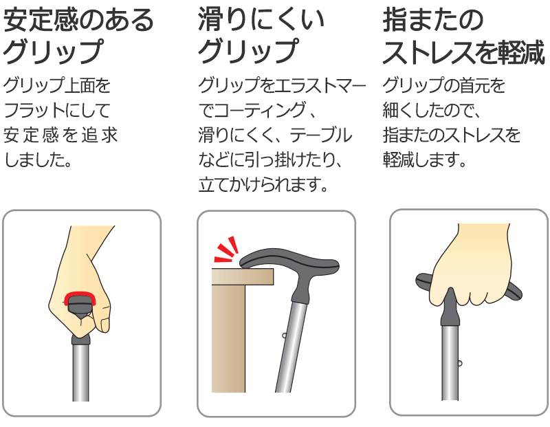 商品名ウォーキング・ステッキ・杖 シニアサポート 歩く力を応援 アクティブグレース 伸縮S WB3756 ワインレッド詳細アクティブグレース 伸縮S【品番】WB3756 ワインレッド【材 質】●グリップ:ポリプロピレン、エラストマー●シャフト:アルミニウム●ストラップ:ナイロン●先 ゴ ム:合成ゴム【サイズ】約66.5 〜 89.0cm伸縮 10段階調節(2.5cmピッチ)【重 量】約250gページ内検索生地品番一覧:WB3756 ワインレッド床周り関連キワード:ウォーキング ステッキ 杖 伸縮 転倒 防止 歩行サポート プレフレイル フレイル対策 サルコペニア 筋肉減弱症 予防 足裏圧認識歩行 移動機器 医療機器 外出促進 介護装備 杖 シルバーカー シニア シニアサポート WalingStickウォーキング・ステッキ・杖自分の脚で歩けなくなる前の早い段階から、歩行サポート用品を使用することにより、「活動的になる。」「よい姿勢になる。」「転倒を防げる。」といったプラスのイメージを持っていただく。その願いが「Walking Stick(ウォーキング・ステッキ)」です。特長安定感のあるグリップ。グリップ上面をフラットにして安 定 感 を 追 求しました。グリップをエラストマーでコーティング することで滑りにくく、テーブルなどに引っ掛けたり、立てかけられます。グリップの首元を 細くしたので、指またのストレスを軽減します。アクティブグレース 伸縮S【品番】WB3756 ワインレッド【材 質】●グリップ:ポリプロピレン、エラストマー●シャフト:アルミニウム●ストラップ:ナイロン●先 ゴ ム:合成ゴム【サイズ】約66.5 〜 89.0cm伸縮 10段階調節(2.5cmピッチ)【重 量】約250gいつまでも自分の脚で歩いて健康に。この願いを込めて、フジホームでは、歩行サポート用品を中心に、いつまでも健康にすごせる住まいと暮らしをより良いものへと変えるために、安心・快適な生活を提案していきます。プレフレイル&フレイル対策で「いつまでも自分の脚で歩いて健康に!」フレイル対策には「しっかり歩く」ことが大切で、サルコペニア(筋肉減弱症)予防にも役立ちます。歩くための筋肉維持と正しい姿勢は、歩行速度を速くする。歩幅を広くする。意識的な歩行運動の実践(足裏圧認識歩行)が必要です。転倒予防には、バランス機能の向上。姿勢を良く保つ。自立歩行に不安になったら歩行機器を早い段階で使う事が大切です。社会参加促進には、外出促進するための手段(移動機器等)と目的(行きたい場所:日常と非日常)を作る事も大切です。