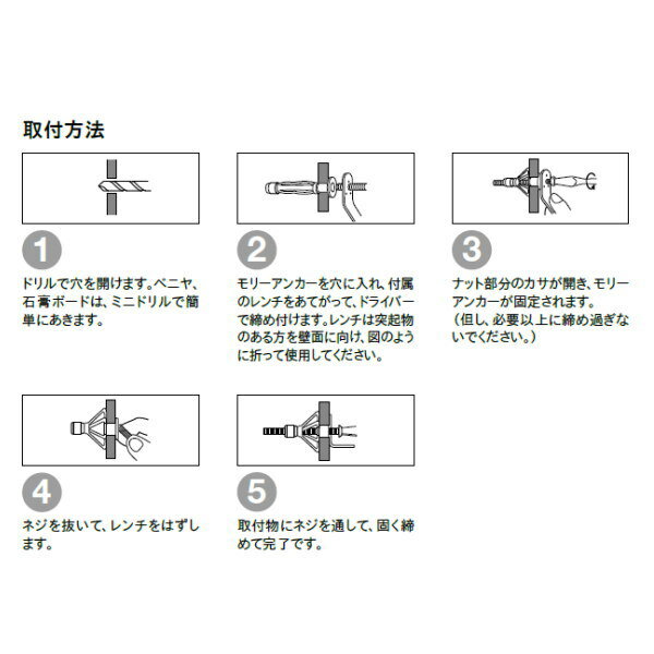 スタンダードタイプ金属製アンカー、カサが開いてガッチリ固定できます。 各種ボード、金属板、ベニヤ板等、取付板厚6.0mmから14.0mmまで対応します。 用途に合わせてお選びいただけます。 ※取付ネジがセットされています。 素材:スチール●お支払い方法で代引きはできません。 ●ご注文後の変更やキャンセル、ご返品等はお受けできませんので予めご了承ください。 ●トーソーのカーテンレールやピクチャーレールと同時ご注文の際はカーテンレールの方の送料1650円に合わせます。2.73m以上の長さの場合は送料3300円です。