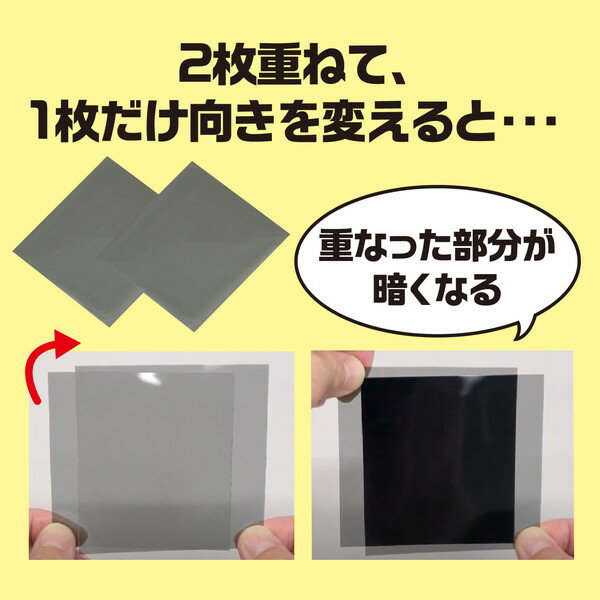 波の性質を持っている光は進行方向に対して直角に振動しています。偏光板は特定の方向に振動している光だけを通過させるという性質を持っています。 ハサミやカッターナイフで簡単に裁断することができるため、いろいろな工作の材料としてお使いいただけます。 本商品には両面、保護フィルムがついていますので、?がしてからご使用ください。 粘着なしタイプ 厚み0.28mm 商品サイズ(単位mm):200×200×0.28mm セット内容:1枚 重量(g):20g 材質:TAC 包装形態:袋 包装サイズ:205x205x1mm 販売単位:枚 生産国:中国 箱の場合の入数:3000