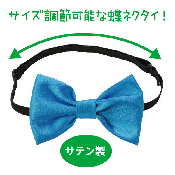 光沢がきれいなサテン製の蝶ネクタイ! 上品な光沢が衣装をグッと引き立てる、サテン素材の蝶ネクタイです。 発表会や運動会、舞台やダンスイベントなど、特別な日のスタイルアップにぴったりです。 首まわりは調整可能なゴムバンド式で、着脱も簡単。 準備や衣装替えの多いイベント時にもサッと装着できます。 衣装に合わせやすいシンプルデザインです。 注意事項 お使いのモニター設定、お部屋の照明等により実際の商品と色味が異なる場合がございます。 商品サイズ(単位mm):リボン:約60×100mm、ひも:首まわり約340〜420mm セット内容:本体のみ 1個重量(g):6 材質:ポリエステル、ゴム、POM 1個包装形態:ヘッダー付き袋入り 包装サイズ(横×高さ×奥行)mm:W70×H160×D7mm 販売単位:個 本体色:青 生産国:ベトナム 箱の場合の入数:500●仕様・寸法については予告なく変更されることがあります。 ●画像はイメージです。代表画像を使用することがあります。 ●ご返品や、交換はできません。