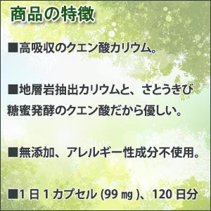 [アレルギー対応]カリウム(クエン酸カリウム) サプリメント 無添加 植物性カプセル120日分【サプリ/ポタシウム/グルテンフリー/健康食品/Potassium/アレルギーリサーチ】