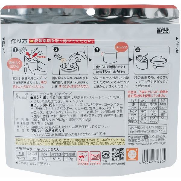 ■サイズ・色違い・関連商品■15食セット 白飯■15食セット わかめご飯■15食セット 五目ご飯■15食セット 野菜ピラフ【当ページ】■15食セット ドライカレー■15食セット 山菜おこわ■30食セット 梅がゆ■30食セット 白がゆ関連商品の検索結果一覧はこちら■商品内容特定原材料等(アレルギー物質)27品目不使用の食物アレルギーに配慮した長期保存食です。● 簡単調理 :お湯または水を注ぐだけ(熱湯で15分、水(20℃)で60分)● 長期保存 :賞味期間は製造日から5年6か月間● 食器不要 :中にスプーンが入っていて、袋が容器になるので袋のまま食べられる● 普段使い :器に盛りつけ、日常のご飯のかわりにも● 設計特性 :軽量コンパクトで携帯性に優れお湯や水を加えても倒れにくい設計なので、アウトドアや旅行のお供におすすめ● アレンジ :お湯や水を使う以外にも、調理アレンジが可能国産うるち米100%使用。香味野菜の香り豊かな洋風ご飯です。スイートコーン・にんじん・パセリが彩りを添えます。※日本災害食学会認証商品です。■商品スペック【商品名】安心米 野菜ピラフ【内容量】100g×15袋/ケース【原材料名】具入り米:うるち米(国産)、乾燥具材(スイートコーン、乾燥にんじん、乾燥たまねぎ、デキストリン)ピラフ調味粉末:食塩、オニオンエキスパウダー、コーンスターチ、砂糖、ガーリックパウダー、カレー粉、野菜エキスパウダー、酵母エキス、ホワイトペッパーパウダー、乾燥パセリ】調味料(アミノ酸等)、香料、微粒二酸化ケイ素、甘味料(ステビア)、香辛料抽出物添加物情報:調味料(アミノ酸等)、香料、微粒二酸化ケイ素、甘味料(ステビア)、香辛料抽出物アレルギー物質:無【賞味期限】常温:5年6か月間(5年保証)【保存方法】直射日光、高温多湿を避けて常温で保存してください。【加工地】島根県【特記事項】大口数量注文の場合、納期にお時間が発生します。【注意事項】袋のフチで手を切らないよう注意してください。開封後は早めに召しあがってください。アレルギーが心配な方やアレルギー症状が重篤な方は、医師にご相談の上、召しあがってください。【配送について】本商品は、北海道・沖縄・離島への配送はいたしかねます。あらかじめご了承ください。■送料・配送についての注意事項●本商品の出荷目安は【5 - 8営業日 ※土日・祝除く】となります。●お取り寄せ商品のため、稀にご注文入れ違い等により欠品・遅延となる場合がございます。●本商品は仕入元より配送となるため、沖縄・離島への配送はできません。
