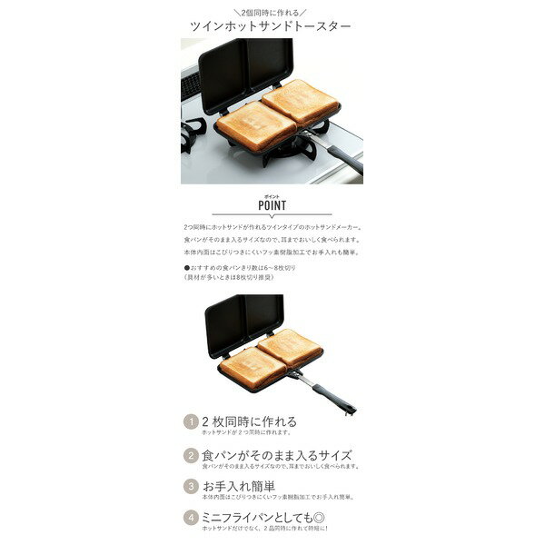 ■商品内容2つ同時にホットサンドが作れるツインタイプのホットサンドメーカー。お好みの具を挟んで焼くだけで、カフェ風の具沢山ホットサンドが簡単に作れます。食パンがそのまま入るサイズなので、耳までおいしく食べられます。本体内面はこびりつきにくいフッ素樹脂加工でお手入れも簡単。●おすすめの食パン切り数は6〜8枚切り(具材が多いときは8枚切り推奨)■商品スペック【サイズ(約)】全長36×幅25×高さ3.5cm【重量(約)】578g【素材・材質】本体:アルミニウム合金取っ手:フェノール樹脂(耐熱温度150度)止め具:ステンレス鋼【表面加工】内面:ふっ素樹脂塗膜加工外面:焼付け塗装【熱源】直火対応・卓上ガスコンロ専用(Siセンサー付コンロには使用できません)※底面中央が凹んでいるため、Siセンサーが密着せず、火力が小さくなり途中で消火する場合があります。【分解(着脱)】不可【おすすめシーン】アウトドア・キャンプ・BBQ朝食・おやつ・夜食など【注意事項】・IH、オーブン、電子レンジでは使用できません。・つけ置き洗いや食器洗い乾燥機には使用しないでください。【原産国】中国【同シリーズ】●フッ素加工IHホットサンドトースター●フッ素加工ツインホットサンドトースターフッ素加工ワッフルメーカー※このページは【フッ素加工ツインホットサンドトースター】を販売しております。■送料・配送についての注意事項●本商品の出荷目安は【2 - 6営業日 ※土日・祝除く】となります。●お取り寄せ商品のため、稀にご注文入れ違い等により欠品・遅延となる場合がございます。●本商品は仕入元より配送となるため、沖縄・離島への配送はできません。【 D-6538 】