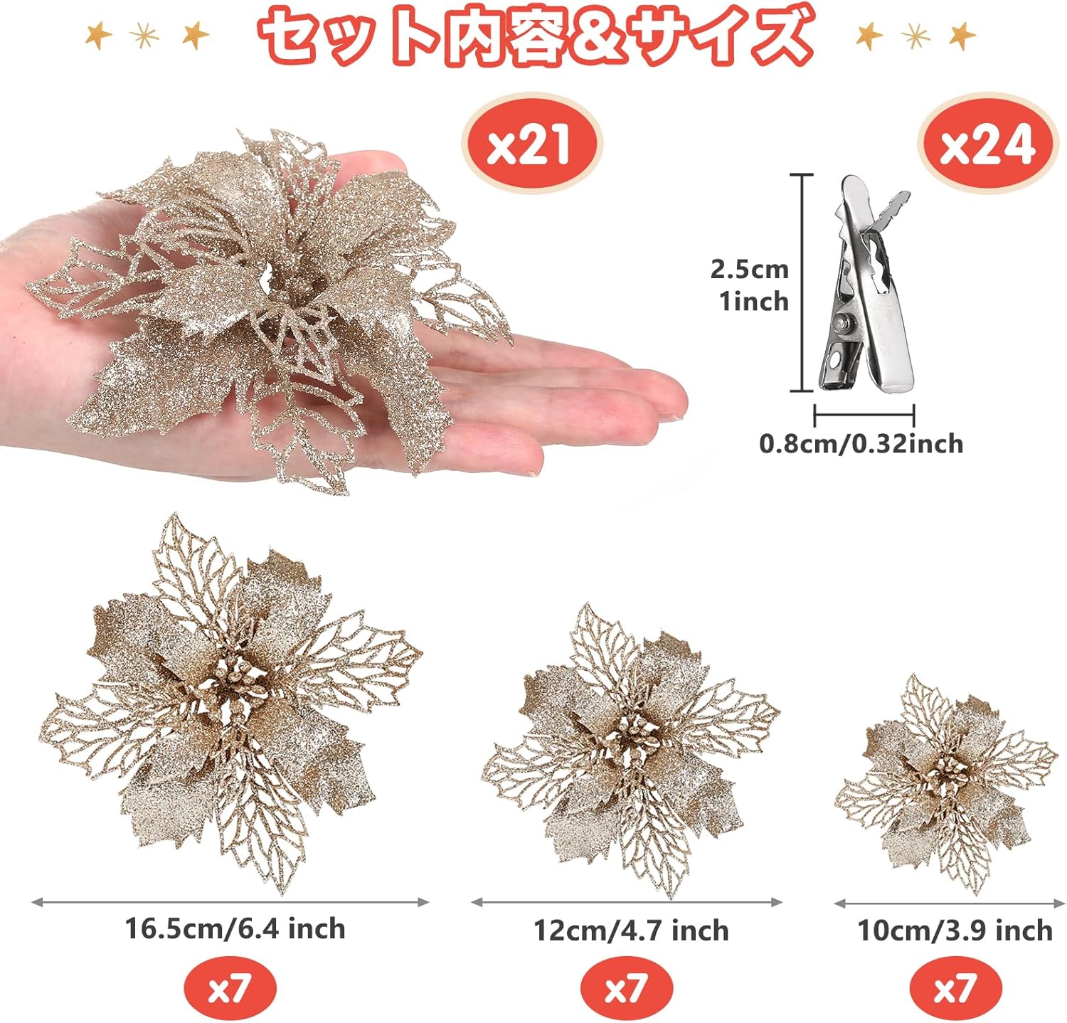 クリスマス 飾り オーナメント 21個入 クリップ付き ポインセチア 造花 クリスマスツリー飾り クリスマスリース 装飾 飾り付け ラメ入り キラキラ 自宅 店舗 玄関 シャンパン