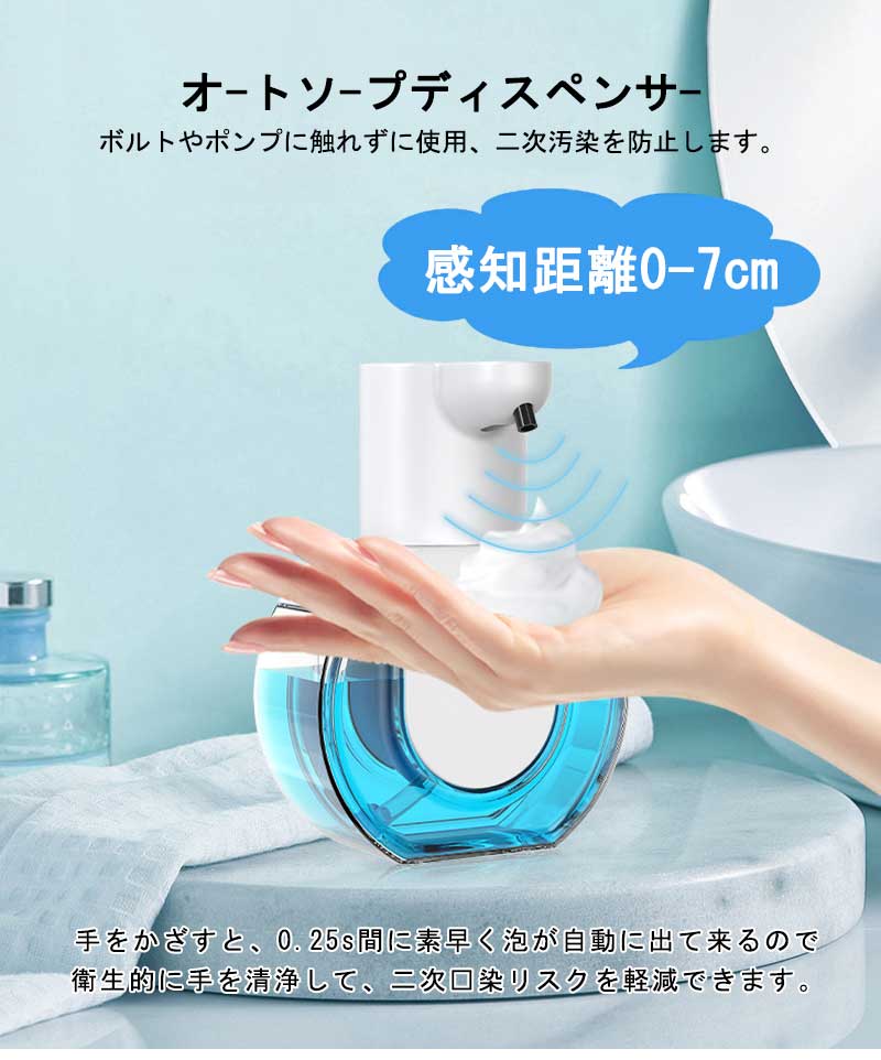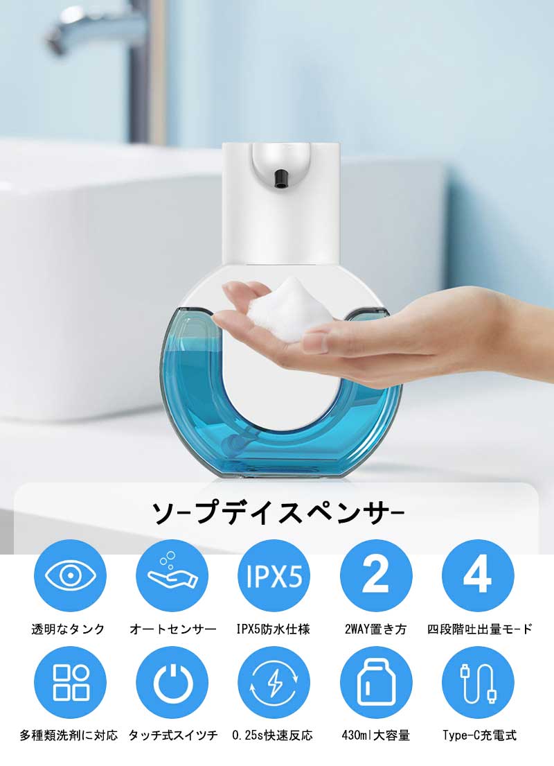【自動で泡が出るハンドソープディスペンサー】 手をかざすだけで、0.25s間にオートディスペンサーが反応し、泡状のハンドソープが自動的に出ます。最初から泡で出てくるので自分で泡だてることが苦手なお子様にも最適です。また、洗う前の汚れた手であちこち触らないで済むので、ディスペンサーの本体も清潔に保てます。自動センサーの感知距離は約0〜7cmで、家庭やオフィスにぴったりのアイテムです。キッチンやバスルームで、簡単で衛生的な手洗いが実現。快適な手洗い体験をお楽しみください。 ※注意:洗浄用のボトルを付属しません、予めご了承下さい。 【ハンドソープ 自動 泡&4段階に吐出量調節】 ソープディスペンサーの本体に1200mAhのリチウム電池が内蔵、一回フル充電、約三ヶ月で使用可能。便利なtype-C充電式なので、配線を気にせず、コンセントのない場所でもすぐに使用可能です。更に、ソープディスペンサー専用の壁掛けフックを付属しており、壁に穴を開けずに設置可能で省スペースです! 【430mL大容量の透明タンク】 430mLの大容量で、洗剤やハンドソープを頻繁にディスペンサーに補充する必要はありません。透明なボトルで、残量が一目で確認できます。IPX5 防水仕様で、洗面台やキッチンなど水回りでも安心して使用できます。さらに、クリーニングモード機能も搭載されており、ディスペンサーがONまたは待機状態のときにスイッチを素早く3回タッチするだけで、10秒間のショット噴射が行われ、ノズルの詰まりを効果的に防ぐことができます。このディスペンサーは、便利で使いやすい設計が魅力です。 【手洗い用・食器洗剤用にも大活躍】 シンプルでスタイリッシュなデザインのオートディスペンサーは、どの場所にも適応できます。インテリアとしてナチュラルにお部屋に馴染み、さまざまな場所で衛生管理に役立ちます。自宅、学校、幼稚園、ホテル、オフィスなど公共の場での衛生管理やウイルス対策・感染予防に最適です。 【注意事項】 ●仕入れる生産ロットにより、色合いや模様の出方が若干変わる場合がございます。予めご了承ください。 ●ご使用されているパソコンのモニターや、携帯電話のメーカー、機種、画面設定等により、実際の商品の色と異なって見える場合がございます。 ●画像はイメージであり、商品の仕様は予告なく変更される場合がありますので予めご了承ください。 ●在庫が無い場合お取り寄せとなります。発送までに土日祝を除き、7-12営業日ほどお時間を頂く場合がございます。 ●在庫がある商品は、 2-3営業日に発送予定です。(店舗休業日を除く) ●ご購入前のお客様へのお願い:ご購入前に商品についてお問い合わせいただく場合、恐れ入りますが「商品型番」をご記載ください。 ●ご購入後のお客様へのお願い:ご購入後にお問い合わいただく場合、恐れ入りますが「お名前・ご注文番号」をご記載ください。 【品質保証】 ★ご購入日(商品出荷日より起算)より、6ヶ月の保証期間となります。 期間内に、通常使用(取扱い説明書に準ずる)にて発生した不具合に限り、無料で交換対応させて頂きます。 ★当店では保証書の発行を行っておりませんが、ご注文日、ご注文番号、出荷日の管理を適切に行っております。 お客様におかれましてはご注文番号が保証書の代わりとなりますので、受信したメールなどの保管をお願い致します。 ★保証対象外となる例(自然故障&物損故障問わず) *「故障原因に心当たりがなく、普通に使用していただけ」等の自然故障の症状との認識でご連絡された場合でも、メーカーの判断によっては、「物損故障の原因によるもの」と判断された場合は、自然故障のみの保証では、保証対象外となりますので、予めご了承ください。 *外観のキズや変形&汚れ等があっても保証対象外となりますし、カビ&錆び&変色等、経年変化に含まれるものや、異物除去や清掃で改善する症状も物損保証対象外となります。 ★対応方法 ・保証期間内に対象となった商品がございましたら、当店までお問い合わせ/メールにてご連絡下さいませ。 ※ご購入時のご注文番号を必ずご記載の上、メールにてご連絡下さい。 ※不具合個所の画像/動画をお送り下さい。 ※破損が起きたご使用状況をメールにてご説明下さい。 当店で確認後、状況に応じた対応をさせて頂きます。。 メーカー希望小売価格はメーカーカタログに基づいて掲載しています