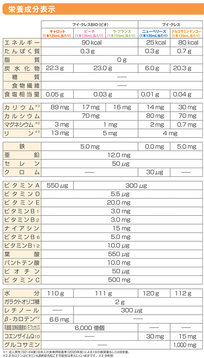 1日1本でしっかり微量栄養素補給。 ビタミン・ミネラル配合飲料「ブイ・クレス」に乳酸菌が加わってリニューアルしました。 12種類のビタミンと亜鉛、セレンなどのミネラルを配合し、積極的な栄養管理をサポートします。さらに乳酸菌「E.フェカリス」を6,000億個配合しました。 爽やかな味わいで、さらに飲みやすくなりました。 注目の"乳酸菌"を追加配合 125mLあたり「E.フェカリス」6,000億個配合:注目の乳酸菌「E.フェカリス」は小さい球菌だから多量配合が可能で、ヨーグルトの約48倍の量を実現できました。 「加熱殺菌菌体」で配合 加熱殺菌処理により、機能性成分のみを残すことで、菌の力を最大限に発揮できます。 甘すぎず、さわやかな味わい ジュース感覚で毎日続けられるおいしさ。キャロット、ピーチ、ラ・フランスともに、さわやかな味わいになりました。 ビタミン・ミネラルの配合はそのまま、乳不使用に 一日摂取基準*の平均2〜3 倍のビタミン(12 種類)、ミネラル(鉄、亜鉛、セレン等)の配合はそのまま。乳不使用で、乳アレルギーの方にもご利用いただけます。 鉄は、摂取基準*の67%含んでいます。 *成人男性(50〜69歳)日本人の食事摂取基準(2015年版)より お召し上がり方 1日1本を目安にお召し上がりください。 内容量 125mL×30本/箱 原材料名 【ラ・フランス】ブドウ糖(国内製造)、ガラクトオリゴ糖、砂糖、果汁(ラ・フランス、西洋なし、バナナ)、還元水飴、乾燥酵母、乳酸菌/V.C、乳酸Ca、香料、V.E、クエン酸鉄Na、増粘多糖類、ナイアシン、パントテン酸Ca、着色料(紅花黄、クチナシ)、V.B6、V.D、V.A、V.B2、V.B1、葉酸、V.B122 保存方法 常温・暗所 ご注意 ・容器に膨張・破損が見られるもの、開封時に色・におい・味等に異常のあるものは使用しないでください。 ・開封後はすみやかに使用してください。 ・凍結するような場所や光、高温を避け、常温・暗所にて保存してください。 ・落下や衝撃等は漏れ・破損の原因となりますのでご注意ください。 ・衛生上、容器の再利用・別用途での使用はおやめください。 ・以下の微量栄養素はまかなえません。 [ ビタミンK、マンガン、銅、ヨウ素、モリブデン ] ・原料由来の成分が沈殿することがありますが、品質には問題ありません。 ・過剰摂取は避けてください。 賞味期限 製造日より240日