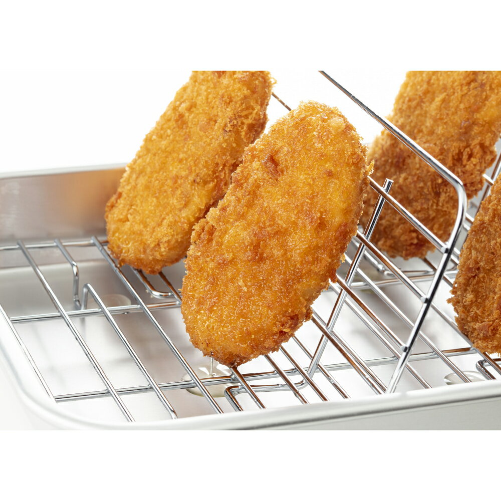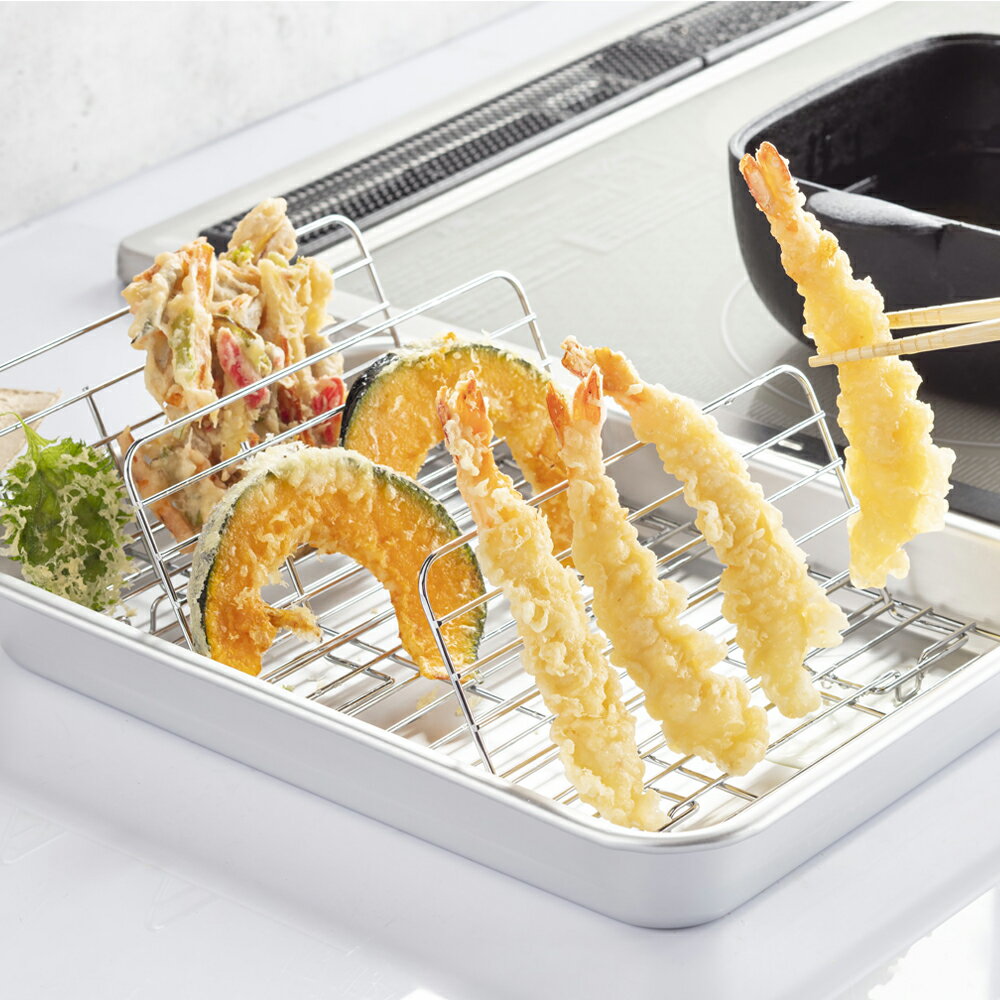 幅32cm×奥行23cm×高4.1cm 材質 網:鉄(クロームメッキ) 本体:アルミ(アルマイト加工) 日本製 天ぷらを立てることで効率よく油をカット!時短&カラッとヘルシーに仕上がります。 用途に合わせて位置や枚数を調整可能な着脱式アミ付きです。 コンパクトに収納、取り外し簡単で丸洗いもOK! アミを外して冷凍保存用のアルミバットとしても使用可能!熱伝導が良く美味しさを保ったまま冷凍。深型で使いやすい!