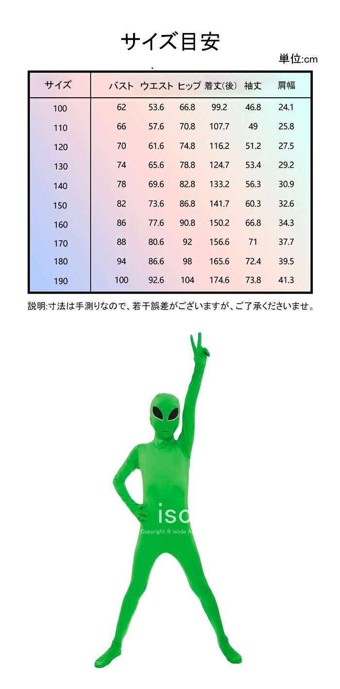 Item Information 商品名 コスチューム コスプレ 仮装 素材 ポリエステル 説明 宇宙人コスチュームを着て、エイリアンを抱きしめて未知の宇宙へ冒険しましょう。宇宙人に愛を示し、星間旅行を楽しみたいときに最適です。 イベント、パーティー、ハロウィン、クリスマスなどで大活躍♪ ご注意 ※30度のぬるま湯に中性洗剤を薄めて優しく単品手洗いして下さい。 ※お客様のモニター環境により実物の色合いと若干お色目が異なる場合がございます。 ※商品生地、色合い、コサージュやその他装飾部品の色やデザイン等、生産時期 によって、差異が生じます。そのため、同じ商品を複数点ご購入の場合、場合に よって色、コサージュのデザイン等差異がでる場合がございます。ご了承ください。 ※着用・保管頂きます際には他のものとの摩擦などにより色移りや傷になる場合が 御座いますのでご注意ください。