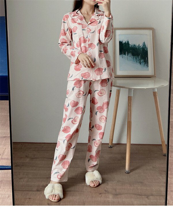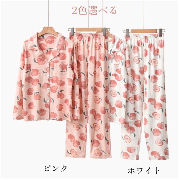 パジャマ レディース 夏用 上下セット 桃柄 かわいい 前開き長袖 春 秋 ルームウェア コットン 可愛い 入院 シャツパジャマ 新生活 おしゃれ ナイトウェア 部屋着 寝巻 吸汗速乾 ウエストゴム 胸ポケット ピーチ M L XL ホワイト ピンク