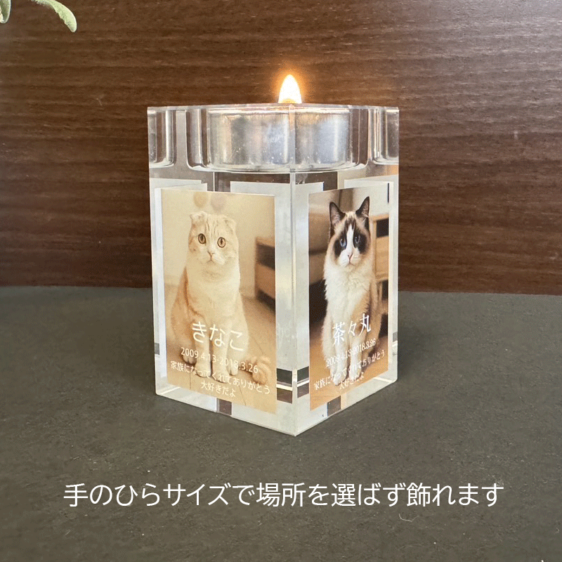 商品情報サイズ7.8×4.8×4.8素材ガラス高級ガラス キャンドルスタンド キャンドル キャンドルホルダー ろうそく 名入れ メモリアルスタンド メモリアルプレート 位牌 蝋燭 おしゃれ 犬 猫 うさぎ 命日 お悔み ペットグッズ ペット 仏壇 彫刻 名前入り お供え 仏具 遺影 ペット供養 線香立て フォトフレーム 写真を送るだけ キャンドル付き 小さな仏具 仏壇にピッタリなサイズです メモリアル キャンドルスタンド 大切なペットちゃんとの思い出に… ガラス製 名入れ 遺影 【ペットメモリアルキャンドル】 写真から作るメモリアルキャンドル大切な家族との思い出を、あたたかな灯りの中に閉じ込めて。お送りいただいたお写真をそのまま印刷し、世界にひとつだけのキャンドルをお作りします。飾るだけで心がやさしく包まれる、ぬくもりあるメモリアルアイテムです。🌸 一押しポイント写真を送るだけで簡単オーダー 画像のトリミングや加工は不要。こちらで最適なバランスに整えます。最大4枚まで写真を配置可能 お好みに合わせて1枚~4枚まで自由にデザインできます。一点ずつ丁寧に制作 職人が一つひとつ確認しながら、心を込めてお作りしています。・素材:高級クリスタルガラス・プリント枚数:1枚/2枚/4枚(選択可)・名入れ:英字・日付・メッセージ対応・サイズ:約7.8*4.8*4.8cm(手のひらサイズ)・用途:ペットメモリアル/供養/命日/お別れギフト/虹 写真を送るだけで完成 名入れ・日付・メッセージ刻印対応 お仏壇・リビングに馴染む上品サイズ 虹の橋を渡った大切な子を、形に残したい方へ ペットを亡くされたご家族や友人への贈り物に お仏壇やリビングにさりげなく飾りたい方へ 大切な家族の一員として、たくさんの幸せをくれた子たち。その存在は、姿が見えなくなっても心の中でずっと生き続けています。「もう一度あの子に会いたい」「ありがとうを伝えたい」そんな想いを少しでも形にできたら――そんな気持ちから、このメモリアルキャンドルを作りました。写真を光に包むことで、まるでそばで見守ってくれているようなぬくもりを感じられます。見るたびに心がほっとする、優しい時間を過ごしていただけたら嬉しいです。お客様ひとりひとりの想いを大切に、一つずつ心を込めてお作りいたします。このキャンドルが、あなたと大切な子をそっとつなぐ光になりますように🌈<対応犬種>秋田犬 アフガンハウンド イングリッシュスプリンガースパニエル アイリッシュセッター イタリアングレーハウンド ウィペット ウェルシュコーギー ウェルシュテリア ウエストハイランドテリア エアデール オールドイングリッシュシープドッグ セントバーナード 甲斐犬 キャバリアキングチャールズスパニエル グレートデン ケアーンテリア ケリーブルテリア コッカースパニエル ゴールデンレトリバー シェトランドシープドッグ シーズー 柴犬 シベリアンハスキー ジャックラッセルテリア ジャーマンシェパード スカイテリア スコッティテリア スタッフォードシャーブルテリア スピッツ ダックスフンド ダルメシアン チワワ チャイニーズクレステッドドッグ チャウチャウ 狆 トイプードル バーニーズマウンテンドッグ パグ バゼットハウンド パセンジー パピヨン ビーグル ブルテリア ブルドッグ フレンチブルドッグ プードル ポインター ボクサー ボストンテリア ボーダーテリア ポメラニアン ボルゾイ アスティフ マルチーズ ミニチュアシュナウザー ミニチュアピンシャー ミニチュアダックスフンド ドーベルマン ヨークシャーテリア ラブラドールレトリバー ワイマラナー デザイン確定後 5日以内に発送1