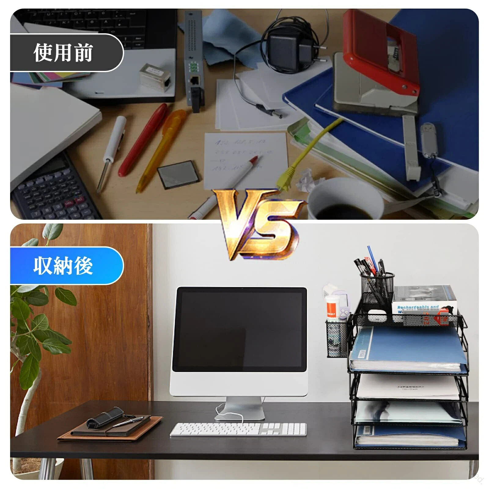 この商品について【多機能なファイルラック】: 書類整理 に デスク上にも置ける ラック は 仕事上の 書類整理、文房具などを収納できます。仕 事で必要なものをまとめて収納や散らかりがちなデスク周りの整理整頓に最適な書類トレーです! 机の上がすっきり片付くと仕事や勉強仕事の効率があがると繋がります。【A4の大きさで4段の大容量】: ファイルの種類によって収納を分けれて使用便利な書類ラック。4段の仕切り付きなので使い勝手が 良く、ファイル、新聞や雑誌などの仕分け収納にピッタリです!きちんと整理することで、デスク を広く使えます。筆記用具などの文房具からタブレットまで、トレーにまとめて収納できます。【小物や雑貨置きに】: デスク周りに散らばりがちな文房具や細かい備品(名刺、ホッチキスなど)を置くのに便利な上部 ラック;ペン立てにはハサミやスティックのりなどを収納します。よく使用するペンなどが乱雑に 散らばるのを防ぐ。オープンタイプになっているので取り出しも収納も楽々です。【組み立てと分解簡単】: ゴチャゴチャしないシンプルなデザインで、工具不要、ただ乗せていくだけで設置が簡単。複数を 組み合わせることで、立派な収納ラックに。必要に応じて段数を変更することもでき、軽くて移動 がラクラクです。構造は十分に安定しており、樹脂製より書類の重さに耐えられ、揺れず変形しに くいです。【上品な金属製で長持ち】: 卓上収納ラックは頑丈なスチールワイヤーメッシュで作られ、中身が見やすく、通気性も良いです 。しっかりしたつくりなので、長期にわたる使っても塗装が剥がれません。なめらかなブラック仕 上げで落ち着いた外観で、オフィスなどのインテリアにも馴染んでいる事務用品です。 指定された配送時間は承っておりません。【01 marche】