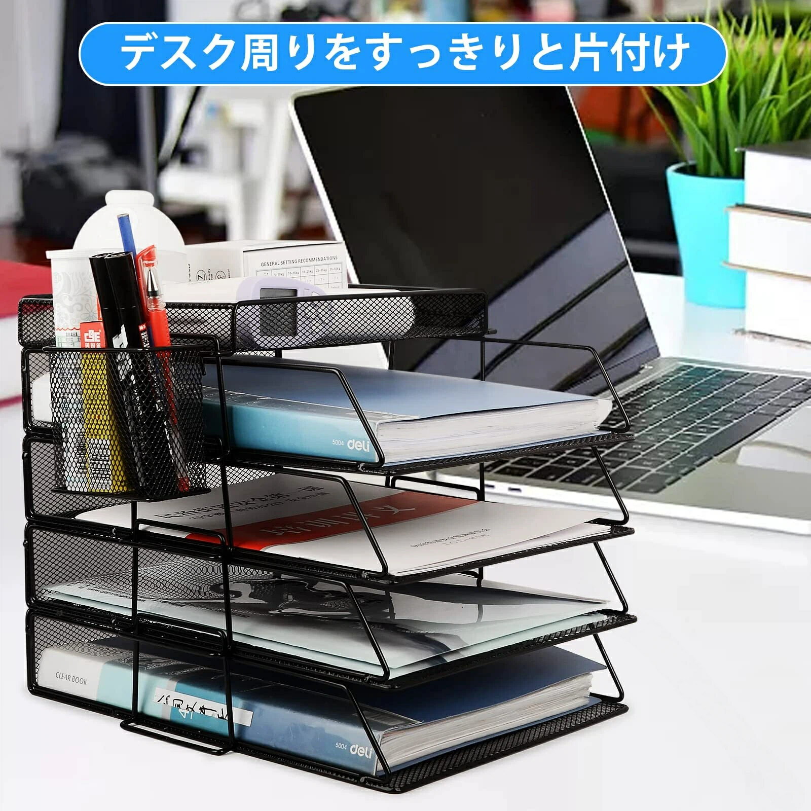 書類トレー 4段 縦置き 卓上収納ラック 積み重ね可能 A4レターケース ファイルボックス 引き出し付き 書類整理用 小物入れ ペン立て 文房具収納 ブラック オフィス用品 事務用品 人気の卓上整理ラック