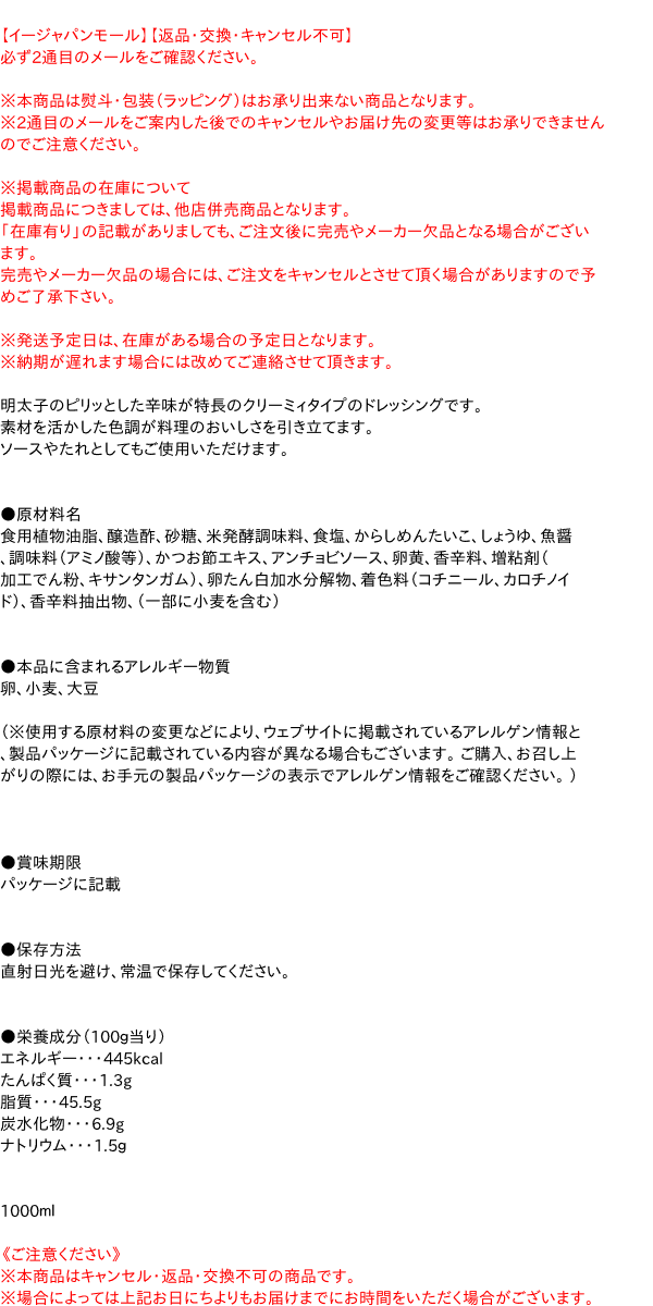 【イージャパンモール】【返品・交換・キャンセル不可】 必ず2通目のメールをご確認ください。 ※本商品は熨斗・包装(ラッピング)はお承り出来ない商品となります。 ※2通目のメールをご案内した後でのキャンセルやお届け先の変更等はお承りできませんのでご注意ください。※商品はご注文(ご決済)後、3-5営業日で発送(土・日・祝日除く)となります。※配送業者と契約がないため、送付先が北海道・沖縄・離島の場合キャンセルとさせていただきます。※掲載商品の在庫について 掲載商品につきましては、他店併売商品となります。 「在庫有り」の記載がありましても、ご注文後に完売やメーカー欠品となる場合がございます。 完売やメーカー欠品の場合には、ご注文をキャンセルとさせて頂く場合がありますので予めご了承下さい。 ※発送予定日は、在庫がある場合の予定日となります。 ※納期が遅れます場合には改めてご連絡させて頂きます。明太子のピリッとした辛味が特長のクリーミィタイプのドレッシングです。 素材を活かした色調が料理のおいしさを引き立てます。 ソースやたれとしてもご使用いただけます。 ●原材料名 食用植物油脂、醸造酢、砂糖、米発酵調味料、食塩、からしめんたいこ、しょうゆ、魚醤、調味料(アミノ酸等)、かつお節エキス、アンチョビソース、卵黄、香辛料、増粘剤(加工でん粉、キサンタンガム)、卵たん白加水分解物、着色料(コチニール、カロチノイド)、香辛料抽出物、(一部に小麦を含む) ●本品に含まれるアレルギー物質 卵、小麦、大豆 (※使用する原材料の変更などにより、ウェブサイトに掲載されているアレルゲン情報と、製品パッケージに記載されている内容が異なる場合もございます。 ご購入、お召し上がりの際には、お手元の製品パッケージの表示でアレルゲン情報をご確認ください。 ) ●賞味期限 パッケージに記載 ●保存方法 直射日光を避け、常温で保存してください。 ●栄養成分(100g当り) エネルギー・・・445kcal たんぱく質・・・1.3g 脂質・・・45.5g 炭水化物・・・6.9g ナトリウム・・・1.5g 1000ml【メーカー・製造または販売元】キューピー株式会社03-3300-0211【広告文責】株式会社イージャパンアンドカンパニーズ 072-875-6666《ご注意ください》 ※本商品はキャンセル・返品・交換不可の商品です。 ※場合によっては上記お日にちよりもお届けまでにお時間をいただく場合がございます。 ※商品の写真はイメージです。 不良品、内容相違、破損、損傷の場合は良品と交換させていただきますが、完売やメーカー欠品などの場合にはご返金でのご対応とさせていただきます。 但し、商品到着から3日以内にご連絡をいただけない場合、ご対応致しかねます。 ※本商品は熨斗・包装(ラッピング)はお承り出来ない商品となります。 ※商品がリニューアルしている場合、リニューアル後の商品にてお届けとなる場合がございます。 リニューアルにより商品内容、容量、パッケージ等が異なる場合であってもキャンセル・返品・交換はお承りしておりません。 ※ご注文後、完売やメーカー欠品等の場合には該当商品をキャンセルとさせていただく場合がありますので予めご了承ください。[関連キーワード:調味料 ドレッシング サラダ タレ たれ 洋食 野菜 めんたいこ 乳化液状ドレッシング]★まとめ買い★ QP 明太子ドレッシング 1L ×9個 はコチラ >>