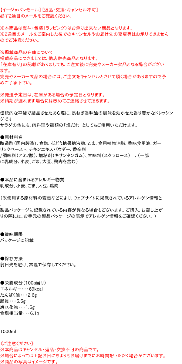 【イージャパンモール】【返品・交換・キャンセル不可】 必ず2通目のメールをご確認ください。 ※本商品は熨斗・包装(ラッピング)はお承り出来ない商品となります。 ※2通目のメールをご案内した後でのキャンセルやお届け先の変更等はお承りできませんのでご注意ください。※商品はご注文(ご決済)後、3-5営業日で発送(土・日・祝日除く)となります。※配送業者と契約がないため、送付先が北海道・沖縄・離島の場合キャンセルとさせていただきます。※掲載商品の在庫について 掲載商品につきましては、他店併売商品となります。 「在庫有り」の記載がありましても、ご注文後に完売やメーカー欠品となる場合がございます。 完売やメーカー欠品の場合には、ご注文をキャンセルとさせて頂く場合がありますので予めご了承下さい。 ※発送予定日は、在庫がある場合の予定日となります。 ※納期が遅れます場合には改めてご連絡させて頂きます。伝統的な平釜で結晶させたあら塩に、長ねぎ香味油の風味を効かせた香り豊かなドレッシングです。 サラダの他にも、肉料理や麺類の「塩だれ」としてもご使用いただけます。 ●原材料名 醸造酢(国内製造)、食塩、ぶどう糖果糖液糖、ごま、食用植物油脂、香味食用油、ガーリックペースト、チキンエキスパウダー、香辛料 /調味料(アミノ酸)、増粘剤(キサンタンガム)、甘味料(スクラロース) 、(一部に乳成分、小麦、ごま、大豆、鶏肉を含む) ●本品に含まれるアレルギー物質 乳成分、小麦、ごま、大豆、鶏肉 (※使用する原材料の変更などにより、ウェブサイトに掲載されているアレルゲン情報と、 製品パッケージに記載されている内容が異なる場合もございます。 ご購入、お召し上がりの際には、お手元の製品パッケージの表示でアレルゲン情報をご確認ください。 ) ●賞味期限 パッケージに記載 ●保存方法 射日光を避け、常温で保存してください。 ●栄養成分(100g当り) エネルギー・・・69kcal たんぱく質・・・2.6g 脂質・・・5.5g 炭水化物・・・1.5g 食塩相当量・・・6.1g 1000ml【メーカー・製造または販売元】キューピー株式会社03-3300-0211【広告文責】株式会社イージャパンアンドカンパニーズ 072-875-6666《ご注意ください》 ※本商品はキャンセル・返品・交換不可の商品です。 ※場合によっては上記お日にちよりもお届けまでにお時間をいただく場合がございます。 ※商品の写真はイメージです。 不良品、内容相違、破損、損傷の場合は良品と交換させていただきますが、完売やメーカー欠品などの場合にはご返金でのご対応とさせていただきます。 但し、商品到着から3日以内にご連絡をいただけない場合、ご対応致しかねます。 ※本商品は熨斗・包装(ラッピング)はお承り出来ない商品となります。 ※商品がリニューアルしている場合、リニューアル後の商品にてお届けとなる場合がございます。 リニューアルにより商品内容、容量、パッケージ等が異なる場合であってもキャンセル・返品・交換はお承りしておりません。 ※ご注文後、完売やメーカー欠品等の場合には該当商品をキャンセルとさせていただく場合がありますので予めご了承ください。[関連キーワード:調味料 ドレッシング サラダ タレ たれ 洋食 野菜]★まとめ買い★ QP あら塩ドレッシング 1L ×9個 はコチラ >>【イージャパンショッピングモール】内のみのお買い物は、送料一律でどれだけ買っても同梱する事が出来ます。※ただし、一部地域(北海道・東北・沖縄)は除きます。※商品に記載されています【イージャパンショッピングモール】の表記を必ずご確認下さい。【イージャパンショッピングモール】の表記以外で記載されている商品に関しまして、一緒にお買い物は出来ますが、別途送料を頂戴します。また、別便でのお届けとなりますのでご了承下さい。※全商品、各商品説明に記載されています注意書きを必ずお読み下さい。※それぞれの【○○館】ごとに、送料等ルールが異なりますので、ご注意下さい。※ご注文確認メールは2通送信されます。送料等の変更がございますので、当店からのご注文確認メール(2通目)を必ずご確認ください。