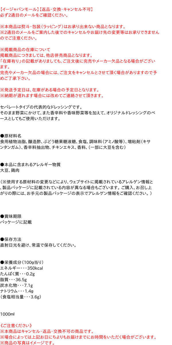 【イージャパンモール】【返品・交換・キャンセル不可】 必ず2通目のメールをご確認ください。 ※本商品は熨斗・包装(ラッピング)はお承り出来ない商品となります。 ※2通目のメールをご案内した後でのキャンセルやお届け先の変更等はお承りできませんのでご注意ください。※商品はご注文(ご決済)後、3-5営業日で発送(土・日・祝日除く)となります。※配送業者と契約がないため、送付先が北海道・沖縄・離島の場合キャンセルとさせていただきます。※掲載商品の在庫について 掲載商品につきましては、他店併売商品となります。 「在庫有り」の記載がありましても、ご注文後に完売やメーカー欠品となる場合がございます。 完売やメーカー欠品の場合には、ご注文をキャンセルとさせて頂く場合がありますので予めご了承下さい。 ※発送予定日は、在庫がある場合の予定日となります。 ※納期が遅れます場合には改めてご連絡させて頂きます。セパレートタイプの代表的なドレッシングです。 そのまま野菜にかけて、また香辛料や香味野菜等を加えて、オリジナルドレッシングのベースとしてもご使用いただけます。 ●原材料名 食用植物油脂、醸造酢、ぶどう糖果糖液糖、食塩、調味料(アミノ酸等)、増粘剤(キサンタンガム)、香辛料抽出物、チキンエキス、香料、(一部に大豆を含む) ●本品に含まれるアレルギー物質 大豆、鶏肉 (※使用する原材料の変更などにより、ウェブサイトに掲載されているアレルゲン情報と、製品パッケージに記載されている内容が異なる場合もございます。 ご購入、お召し上がりの際には、お手元の製品パッケージの表示でアレルゲン情報をご確認ください。 ) ●賞味期限 パッケージに記載 ●保存方法 直射日光を避け、常温で保存してください。 ●栄養成分(100g当り) エネルギー・・・350kcal たんぱく質・・・0.2g 脂質・・・36.5g 炭水化物・・・7.1g ナトリウム・・・1.4g (食塩相当量・・・3.6g) 1000ml【メーカー・製造または販売元】キューピー株式会社03-3300-0211【広告文責】株式会社イージャパンアンドカンパニーズ 072-875-6666《ご注意ください》 ※本商品はキャンセル・返品・交換不可の商品です。 ※場合によっては上記お日にちよりもお届けまでにお時間をいただく場合がございます。 ※商品の写真はイメージです。 不良品、内容相違、破損、損傷の場合は良品と交換させていただきますが、完売やメーカー欠品などの場合にはご返金でのご対応とさせていただきます。 但し、商品到着から3日以内にご連絡をいただけない場合、ご対応致しかねます。 ※本商品は熨斗・包装(ラッピング)はお承り出来ない商品となります。 ※商品がリニューアルしている場合、リニューアル後の商品にてお届けとなる場合がございます。 リニューアルにより商品内容、容量、パッケージ等が異なる場合であってもキャンセル・返品・交換はお承りしておりません。 ※ご注文後、完売やメーカー欠品等の場合には該当商品をキャンセルとさせていただく場合がありますので予めご了承ください。[関連キーワード:調味料 ドレッシング サラダ タレ たれ 洋食 野菜]★まとめ買い★ QP セパレート ドレッシング 1L ×9個 はコチラ >>【イージャパンショッピングモール】内のみのお買い物は、送料一律でどれだけ買っても同梱する事が出来ます。※ただし、一部地域(北海道・東北・沖縄)は除きます。※商品に記載されています【イージャパンショッピングモール】の表記を必ずご確認下さい。【イージャパンショッピングモール】の表記以外で記載されている商品に関しまして、一緒にお買い物は出来ますが、別途送料を頂戴します。また、別便でのお届けとなりますのでご了承下さい。※全商品、各商品説明に記載されています注意書きを必ずお読み下さい。※それぞれの【○○館】ごとに、送料等ルールが異なりますので、ご注意下さい。※ご注文確認メールは2通送信されます。送料等の変更がございますので、当店からのご注文確認メール(2通目)を必ずご確認ください。