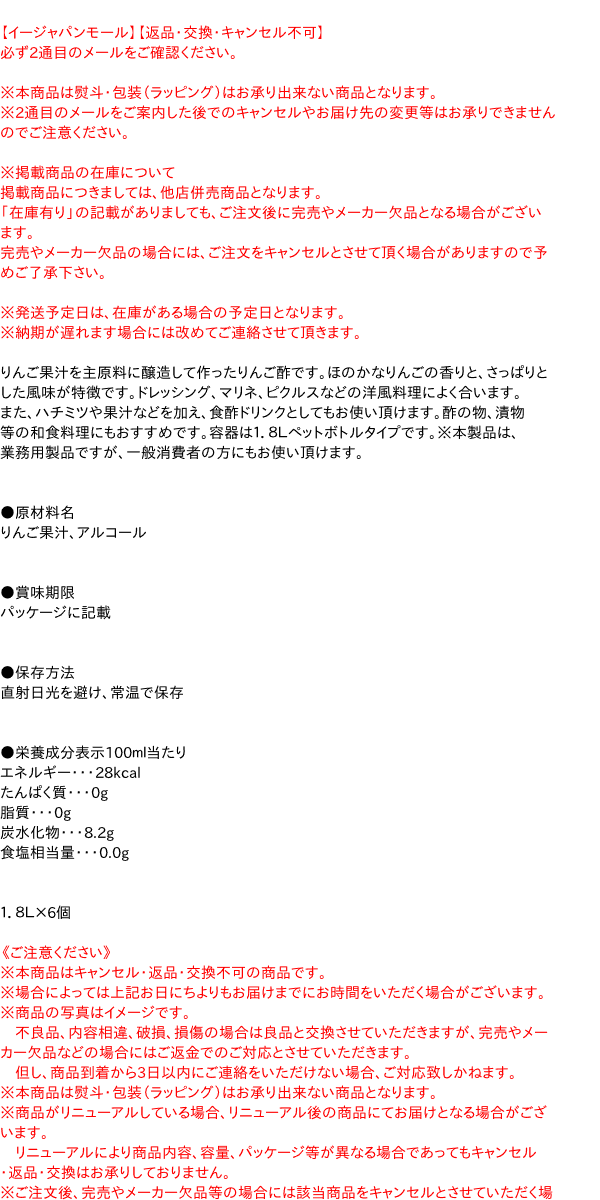 【イージャパンモール】【返品・交換・キャンセル不可】 必ず2通目のメールをご確認ください。 ※本商品は熨斗・包装(ラッピング)はお承り出来ない商品となります。 ※2通目のメールをご案内した後でのキャンセルやお届け先の変更等はお承りできませんのでご注意ください。※商品はご注文(ご決済)後、3-5営業日で発送(土・日・祝日除く)となります。※配送業者と契約がないため、送付先が北海道・沖縄・離島の場合キャンセルとさせていただきます。※送付先が東北の場合別途300円の送料を加算させていただきます。※掲載商品の在庫について 掲載商品につきましては、他店併売商品となります。 「在庫有り」の記載がありましても、ご注文後に完売やメーカー欠品となる場合がございます。 完売やメーカー欠品の場合には、ご注文をキャンセルとさせて頂く場合がありますので予めご了承下さい。 ※発送予定日は、在庫がある場合の予定日となります。 ※納期が遅れます場合には改めてご連絡させて頂きます。りんご果汁を主原料に醸造して作ったりんご酢です。ほのかなりんごの香りと、さっぱりとした風味が特徴です。ドレッシング、マリネ、ピクルスなどの洋風料理によく合います。また、ハチミツや果汁などを加え、食酢ドリンクとしてもお使い頂けます。酢の物、漬物等の和食料理にもおすすめです。容器は1.8Lペットボトルタイプです。※本製品は、業務用製品ですが、一般消費者の方にもお使い頂けます。 ●原材料名 りんご果汁、アルコール ●賞味期限 パッケージに記載 ●保存方法 直射日光を避け、常温で保存 ●栄養成分表示100ml当たり エネルギー・・・28kcal たんぱく質・・・0g 脂質・・・0g 炭水化物・・・8.2g 食塩相当量・・・0.0g 1.8L×6個【メーカー・製造または販売元】株式会社ミツカン0120-243636【広告文責】株式会社イージャパンアンドカンパニーズ 072-875-6666《ご注意ください》 ※本商品はキャンセル・返品・交換不可の商品です。 ※場合によっては上記お日にちよりもお届けまでにお時間をいただく場合がございます。 ※商品の写真はイメージです。 不良品、内容相違、破損、損傷の場合は良品と交換させていただきますが、完売やメーカー欠品などの場合にはご返金でのご対応とさせていただきます。 但し、商品到着から3日以内にご連絡をいただけない場合、ご対応致しかねます。 ※本商品は熨斗・包装(ラッピング)はお承り出来ない商品となります。 ※商品がリニューアルしている場合、リニューアル後の商品にてお届けとなる場合がございます。 リニューアルにより商品内容、容量、パッケージ等が異なる場合であってもキャンセル・返品・交換はお承りしておりません。 ※ご注文後、完売やメーカー欠品等の場合には該当商品をキャンセルとさせていただく場合がありますので予めご了承ください。[関連キーワード:調味料 健康 ドレッシング マリネ ピクルス ドリンク 血圧 業務用]【イージャパンショッピングモール】内のみのお買い物は、送料一律でどれだけ買っても同梱する事が出来ます。※ただし、一部地域(北海道・東北・沖縄)は除きます。※商品に記載されています【イージャパンショッピングモール】の表記を必ずご確認下さい。【イージャパンショッピングモール】の表記以外で記載されている商品に関しまして、一緒にお買い物は出来ますが、別途送料を頂戴します。また、別便でのお届けとなりますのでご了承下さい。※全商品、各商品説明に記載されています注意書きを必ずお読み下さい。※それぞれの【○○館】ごとに、送料等ルールが異なりますので、ご注意下さい。※ご注文確認メールは2通送信されます。送料等の変更がございますので、当店からのご注文確認メール(2通目)を必ずご確認ください。