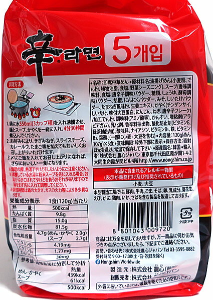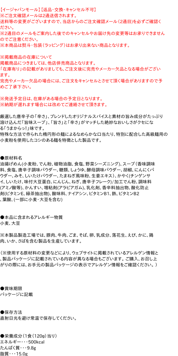 【イージャパンモール】【返品・交換・キャンセル不可】 ※ご注文確認メールは2通送信されます。 送料等の変更がございますので、当店からのご注文確認メール(2通目)を必ずご確認ください。 ※2通目のメールをご案内した後でのキャンセルやお届け先の変更等はお承りできませんのでご注意ください。 ※本商品は熨斗・包装(ラッピング)はお承り出来ない商品となります。※商品はご注文(ご決済)後、3-5営業日で発送(土・日・祝日除く)となります。※配送業者と契約がないため、送付先が北海道・沖縄・離島の場合キャンセルとさせていただきます。※送付先が東北の場合別途300円の送料を加算させていただきます。※掲載商品の在庫について 掲載商品につきましては、他店併売商品となります。 「在庫有り」の記載がありましても、ご注文後に完売やメーカー欠品となる場合がございます。 完売やメーカー欠品の場合には、ご注文をキャンセルとさせて頂く場合がありますので予めご了承下さい。 ※発送予定日は、在庫がある場合の予定日となります。 ※納期が遅れます場合には改めてご連絡させて頂きます。厳選した唐辛子の「辛さ」、ブレンドしたオリジナルスパイスと素材の旨み成分がたっぷり溶け込んだ「旨味スープ」、「旨さ」と「辛さ」がマッチした絶妙なおいしさがクセになる「うまからっ!」味です。 特殊な方法で作られた楕円形の麺によるなめらかな口当たり、特別に配合した高級麺用の小麦粉を使用したコシのある麺を特徴とした製品です。 ●原材料名 油揚げめん(小麦粉、でん粉、植物油脂、食塩、野菜シーズニング)、スープ(香味調味料、食塩、唐辛子調味パウダー、糖類、しょうゆ、酵母調味パウダー、胡椒、にんにくパウダー、みそ、しいたけパウダー、たまねぎ風味粉、生姜エキス)、かやく(チンゲンサイ、しいたけ、味付大豆蛋白、にんじん、ねぎ、唐辛子フレーク)/加工でん粉、調味料(アミノ酸等)、かんすい、増粘剤(アラビアガム)、乳化剤、香辛料抽出物、酸化防止剤(ビタミンE、緑茶抽出物)、酸味料、ナイアシン、ビタミンB1、鉄、ビタミンB2、葉酸、(一部に小麦・大豆を含む) ●本品に含まれるアレルギー物質 小麦、大豆 ※本製品製造工場では、豚肉、牛肉、ごま、そば、卵、乳成分、落花生、えび、かに、鶏肉、いか、さばを含む製品を生産しています。 (※使用する原材料の変更などにより、ウェブサイトに掲載されているアレルゲン情報と、製品パッケージに記載されている内容が異なる場合もございます。 ご購入、お召し上がりの際には、お手元の製品パッケージの表示でアレルゲン情報をご確認ください。 ) ●賞味期限 パッケージに記載 ●保存方法 直射日光を避け常温で保存してください。 ●栄養成分(1食(120g)当り) エネルギー・・・500kcal たんぱく質・・・9.8g 脂質・・・15.0g 炭水化物・・・81.5g 食塩相当量・・・4.7g (めん・かやく・・・2.0g) (スープ・・・2.7g) ビタミンB1・・・4.19mg ビタミンB2・・・1.77mg カルシウム・・・30mg 600g(120g×5食)×8個【メーカー・製造または販売元】株式会社農心ジャパン03-3595-0882【原産国】韓国【広告文責】株式会社イージャパンアンドカンパニーズ 072-875-6666《ご注意ください》 ※本商品はキャンセル・返品・交換不可の商品です。 ※商品の写真はイメージです。 お手元に届く商品は、商品名に記載してある色・柄・型番の商品が届きます。 ※本商品は簡易梱包でのお届けとなります。 ※場合によっては上記お日にちよりもお届けまでにお時間をいただく場合がございます。 ※商品がリニューアルしている場合、リニューアル後の商品をお届けする場合がございます。 リニューアルにより商品内容、容量、パッケージ等が異なる場合であってもキャンセル・返品・交換はお承りしておりません。 ※ご注文をご確認および承らせて頂いた後に、欠品やメーカー廃盤等で商品がご用意出来ない場合は、該当商品をキャンセルとさせて頂きます。 ※不良品、内容相違、破損、損傷の場合は良品と交換させていただきますが、完売やメーカー欠品などの場合にはご返金でのご対応とさせていただきます。 但し、商品到着から3日以内にご連絡をいただけない場合、ご対応致しかねます。[関連キーワード:麺 袋麺 シンラーメン しんラーメン インスタント麺 即席 中華めん 中華麺 ]