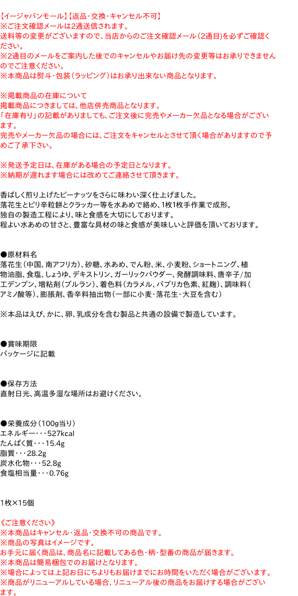 【イージャパンモール】【返品・交換・キャンセル不可】 ※ご注文確認メールは2通送信されます。 送料等の変更がございますので、当店からのご注文確認メール(2通目)を必ずご確認ください。 ※2通目のメールをご案内した後でのキャンセルやお届け先の変更等はお承りできませんのでご注意ください。 ※本商品は熨斗・包装(ラッピング)はお承り出来ない商品となります。※商品はご注文(ご決済)後、3-5営業日で発送(土・日・祝日除く)となります。※配送業者と契約がないため、送付先が北海道・沖縄・離島の場合キャンセルとさせていただきます。※掲載商品の在庫について 掲載商品につきましては、他店併売商品となります。 「在庫有り」の記載がありましても、ご注文後に完売やメーカー欠品となる場合がございます。 完売やメーカー欠品の場合には、ご注文をキャンセルとさせて頂く場合がありますので予めご了承下さい。 ※発送予定日は、在庫がある場合の予定日となります。 ※納期が遅れます場合には改めてご連絡させて頂きます。香ばしく煎り上げたピーナッツをさらに味わい深く仕上げました。 落花生とピリ辛粒餅とクラッカー等を水あめで絡め、1枚1枚手作業で成形。 独自の製造工程により、味と食感を大切にしております。 程よい水あめの甘さと、豊富な具材の味と食感が美味しいと評価を頂いております。 ●原材料名 落花生(中国、南アフリカ)、砂糖、水あめ、でん粉、米、小麦粉、ショートニング、植物油脂、食塩、しょうゆ、デキストリン、ガーリックパウダー、発酵調味料、唐辛子/加工デンプン、増粘剤(プルラン)、着色料(カラメル、パプリカ色素、紅麹)、調味料(アミノ酸等)、膨脹剤、香辛料抽出物(一部に小麦・落花生・大豆を含む) ※本品はえび、かに、卵、乳成分を含む製品と共通の設備で製造しています。 ●賞味期限 パッケージに記載 ●保存方法 直射日光、高温多湿な場所はお避けください。 ●栄養成分(100g当り) エネルギー・・・527kcal たんぱく質・・・15.4g 脂質・・・28.2g 炭水化物・・・52.8g 食塩相当量・・・0.76g 1枚×15個【メーカー・製造または販売元】日進堂製菓株式会社0120-2410-86【広告文責】株式会社イージャパンアンドカンパニーズ 072-875-6666《ご注意ください》 ※本商品はキャンセル・返品・交換不可の商品です。 ※商品の写真はイメージです。 お手元に届く商品は、商品名に記載してある色・柄・型番の商品が届きます。 ※本商品は簡易梱包でのお届けとなります。 ※場合によっては上記お日にちよりもお届けまでにお時間をいただく場合がございます。 ※商品がリニューアルしている場合、リニューアル後の商品をお届けする場合がございます。 リニューアルにより商品内容、容量、パッケージ等が異なる場合であってもキャンセル・返品・交換はお承りしておりません。 ※ご注文をご確認および承らせて頂いた後に、欠品やメーカー廃盤等で商品がご用意出来ない場合は、該当商品をキャンセルとさせて頂きます。 ※不良品、内容相違、破損、損傷の場合は良品と交換させていただきますが、完売やメーカー欠品などの場合にはご返金でのご対応とさせていただきます。 但し、商品到着から3日以内にご連絡をいただけない場合、ご対応致しかねます。[関連キーワード:お菓子 煎餅 ピーナッツ 落花生 あられ おこし おやつ お茶請け]