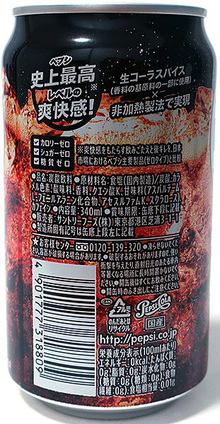 【イージャパンモール】【返品・交換・キャンセル不可】 ※ご注文確認メールは2通送信されます。 送料等の変更がございますので、当店からのご注文確認メール(2通目)を必ずご確認ください。 ※2通目のメールをご案内した後でのキャンセルやお届け先の変更等はお承りできませんのでご注意ください。 ※本商品は熨斗・包装(ラッピング)はお承り出来ない商品となります。※商品はご注文(ご決済)後、3-5営業日で発送(土・日・祝日除く)となります。※配送業者と契約がないため、送付先が北海道・沖縄・離島の場合キャンセルとさせていただきます。※掲載商品の在庫について 掲載商品につきましては、他店併売商品となります。 「在庫有り」の記載がありましても、ご注文後に完売やメーカー欠品となる場合がございます。 完売やメーカー欠品の場合には、ご注文をキャンセルとさせて頂く場合がありますので予めご了承下さい。 ※発送予定日は、在庫がある場合の予定日となります。 ※納期が遅れます場合には改めてご連絡させて頂きます。数十種類ものスパイスの中から選び抜いた「生コーラスパイス」を配合し、非加熱製法で作りあげることで、生コーラスパイスのフレッシュな味わいが最大化され、ペプシ史上最高レベルの爽快感を実現。 「生きかえるうまさ」をお楽しみいただけます。 ●原材料名 食塩(国内製造)/炭酸、カラメル色素、酸味料、香料、クエン酸K、甘味料(アスパルテーム・L−フェニルアラニン化合物、アセスルファムK、スクラロース)、カフェイン ●本品に含まれるアレルギー物質 なし (※使用する原材料の変更などにより、ウェブサイトに掲載されているアレルゲン情報と、製品パッケージに記載されている内容が異なる場合もございます。 ご購入、お召し上がりの際には、お手元の製品パッケージの表示でアレルゲン情報をご確認ください。 ) ●賞味期限 パッケージに記載 ●栄養成分(100ml当り) エネルギー・・・0kcal たんぱく質・・・0g 脂質・・・0g 炭水化物・・・0g 糖質・・・0g 糖類・・・0g 食物繊維・・・0g 食塩相当量・・・0.01g 340ml×24個【メーカー・製造または販売元】サントリーフーズ株式会社0120-139-320【広告文責】株式会社イージャパンアンドカンパニーズ 072-875-6666《ご注意ください》 ※本商品はキャンセル・返品・交換不可の商品です。 ※商品の写真はイメージです。 お手元に届く商品は、商品名に記載してある色・柄・型番の商品が届きます。 ※本商品は簡易梱包でのお届けとなります。 ※場合によっては上記お日にちよりもお届けまでにお時間をいただく場合がございます。 ※商品がリニューアルしている場合、リニューアル後の商品をお届けする場合がございます。 リニューアルにより商品内容、容量、パッケージ等が異なる場合であってもキャンセル・返品・交換はお承りしておりません。 ※ご注文をご確認および承らせて頂いた後に、欠品やメーカー廃盤等で商品がご用意出来ない場合は、該当商品をキャンセルとさせて頂きます。 ※不良品、内容相違、破損、損傷の場合は良品と交換させていただきますが、完売やメーカー欠品などの場合にはご返金でのご対応とさせていただきます。 但し、商品到着から3日以内にご連絡をいただけない場合、ご対応致しかねます。[関連キーワード:飲料 缶飲料 ジュース 炭酸飲料 ソフトドリンク コーラ]